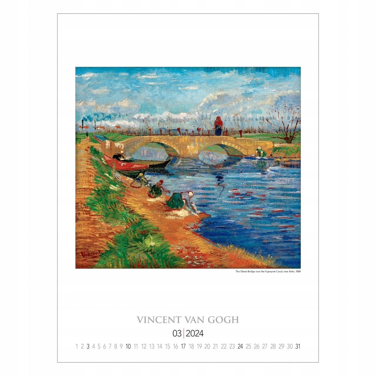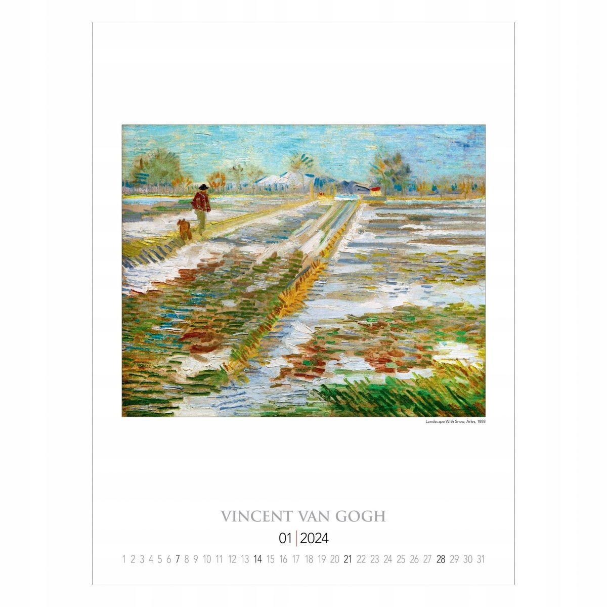 Настенный многопанельный календарь Винсент Ван Гог 2024 представляет репродукции 12 самых известных работ голландского мастера . В календаре на досках большого формата (42 х 56 см) мы можем полюбоваться знаменитыми «Подсолнухами», а также картинами «Пейзаж со снегом», «Мулен де ла Галетт» (Мельница Блют-Фин, Монмартр), «Мост в Глезе через Канал Вигейра, Вид на Вессено близ Овера, Рыбацкие лодки на пляже в Сент-Мари-де-ла-Мер, Звездная ночь и другие произведения Винсента Ван Гога.