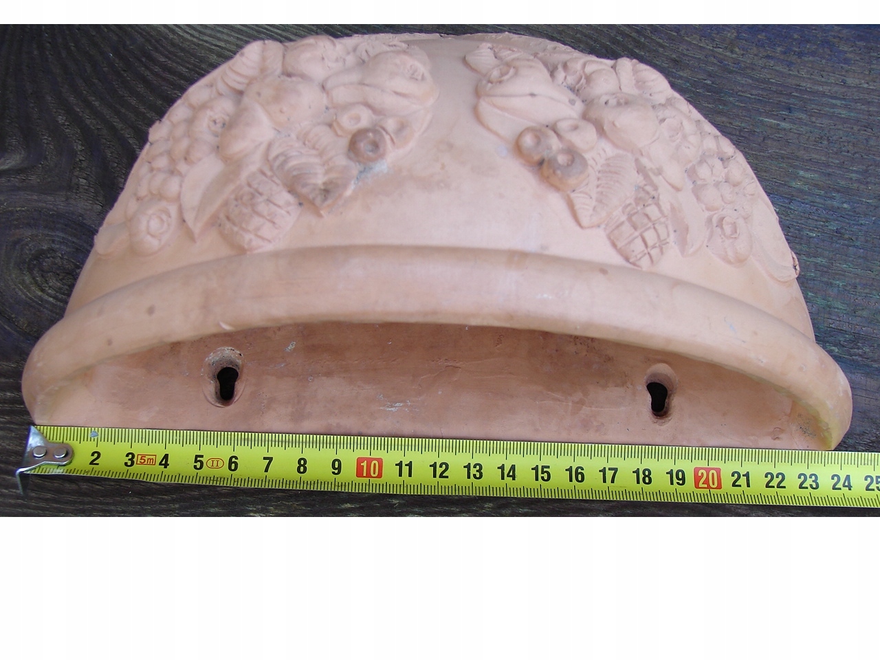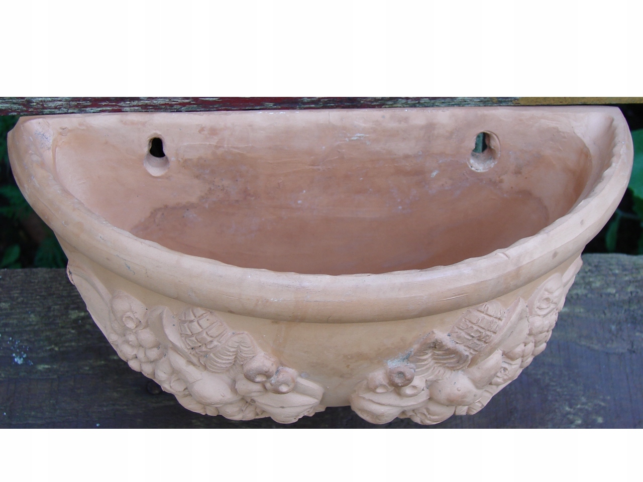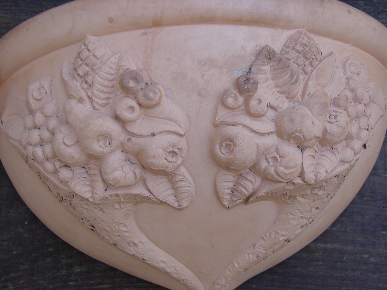 Настенный цветочный горшок целиком из необработанной глины, украшенный фруктовым мотивом в виде барельефа.