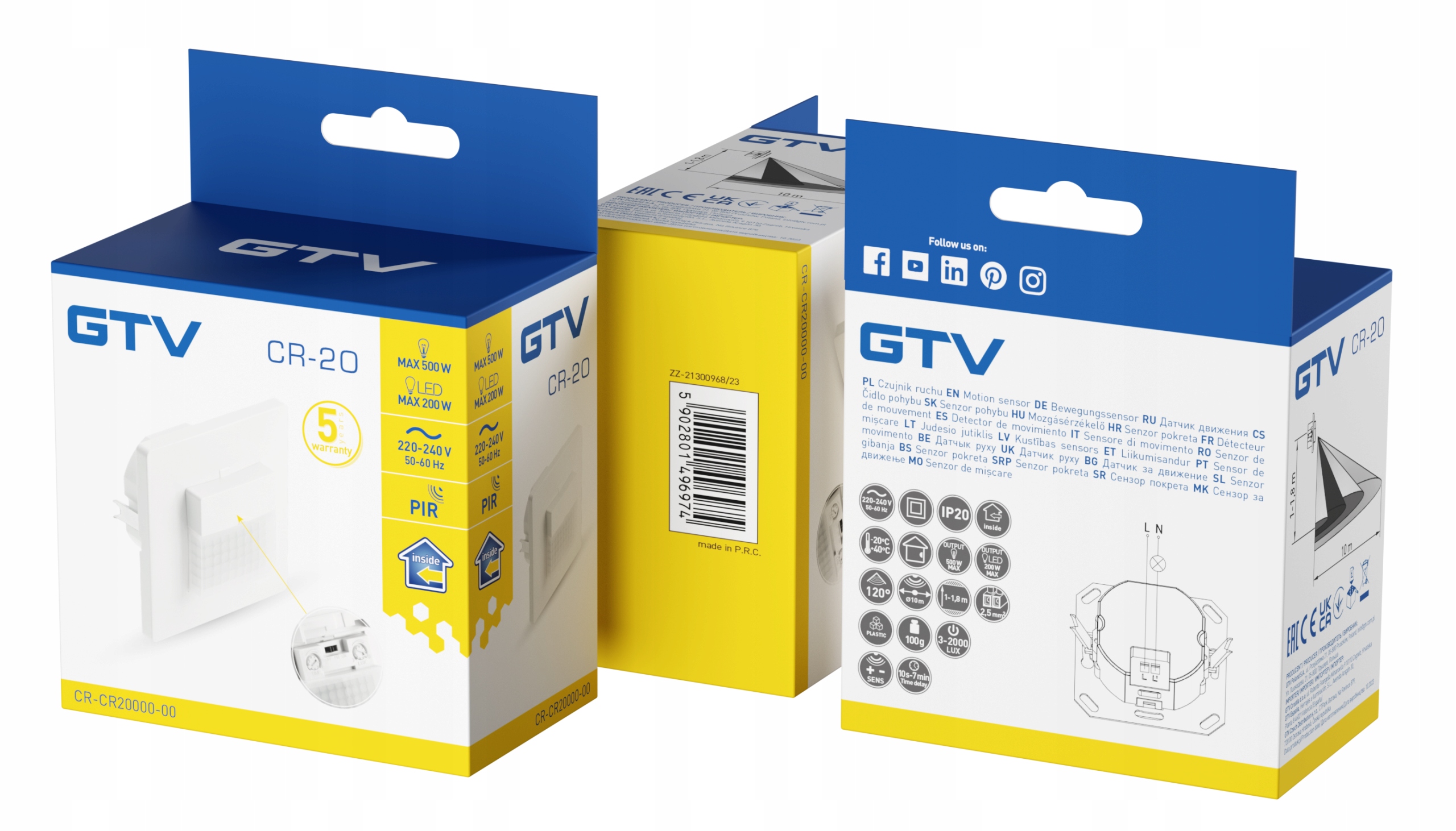 Датчик движения CR-20, макс. 500 Вт переменного тока, 220–240 В, рабочий угол 120, диапазон 10 м ± 1–1,8 м GTV