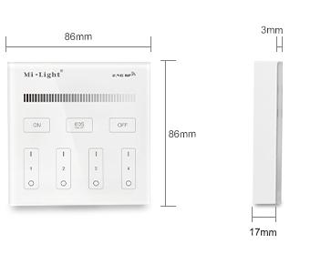 Беспроводной сенсорный контроллер, на батарейках 2xAAA 3В, 4-зонный диммер MONO , настенный, стеклянный, позволяет регулировать яркость с помощью соответствующей одноцветной светодиодной ленты. Радиус действия панели составляет 30 метров. Предназначен для ресиверов FUT036 (доступен на нашем аукционе).