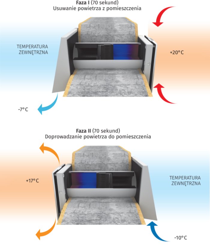 Загрязненный, теплый воздух, удаленный из комнаты к улице, проходит через теплообменник, постепенно нагревая его и придавая часть влаги. После того, как керамический обменник нагревается, устройство автоматически переключается на режим впуска воздуха. Свежий, прохладный воздух снаружи течет через теплообменник, поглощая в нем тепло и влажность. Через 70 секунд теплообменник остывает, устройство переключается на режим и - выхлопнут внутреннего воздуха