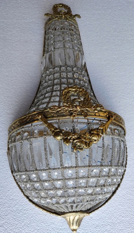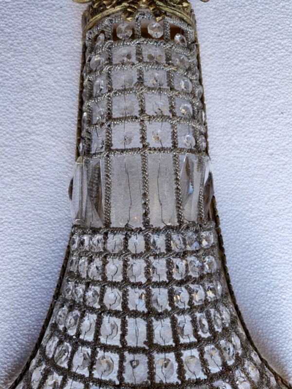 Современно изготовлен из латуни и хрусталя из граненого стекла; был импортирован из Франции. Они представляют собой сочетание латуни и стекла, которое рассеивает преломленные световые лучи, в результате чего получается очень яркий и приятный для глаз свет. Дополнительным декоративным элементом являются светотени, отлитые на стене при так называемом паутинка