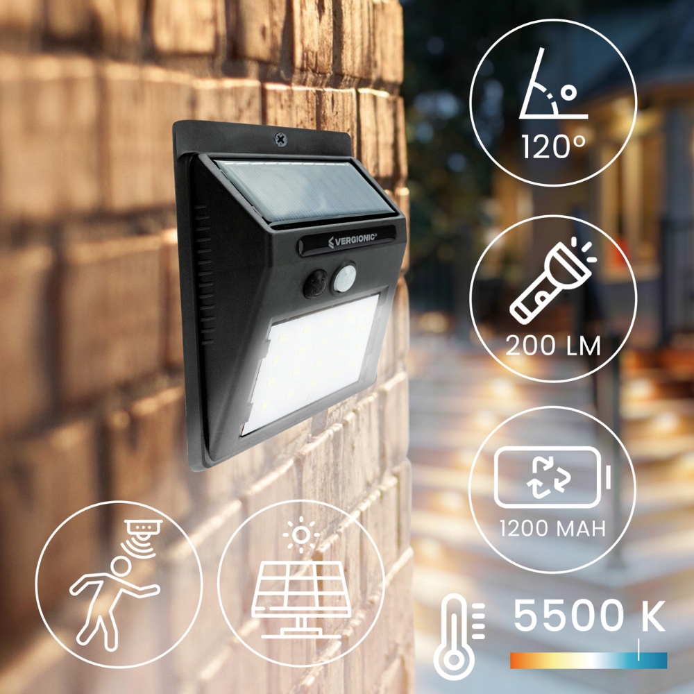 НАСТІННИЙ СВІТІЛЬНИК СВІТЛОДІОДНИЙ СОЛАР 3W/SMD + ДАТЧИК РУХУ СУТІНКИ ЧОРНИЙ VERGONIC