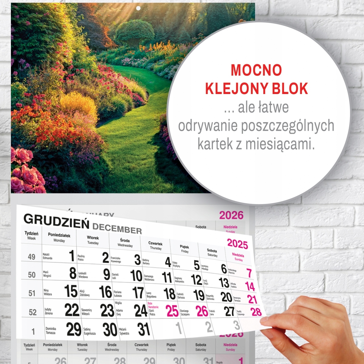 Удобный и понятный календарь с отрывными страницами с декабря 2025 по январь 2027. Названия месяцев и дней недели на польском и английском языках. В календаре отмечены праздники и именины.