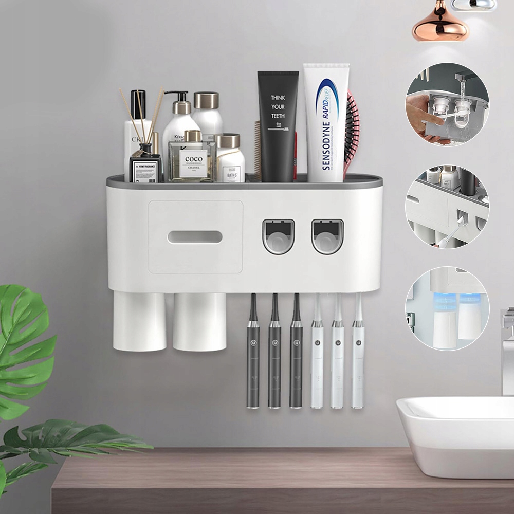 3. Большая вместимость для экономии места: этот держатель для зубных щеток с выдавливателем для зубной пасты вмещает две чашки для зубной пасты, что дает вам место для шести зубных щеток на семью. Также есть место для бритв, косметики для лица и косметики. Также имеется ящик для хранения косметики. Дизайн всей серии сочетает в себе многофункциональные функции хранения.