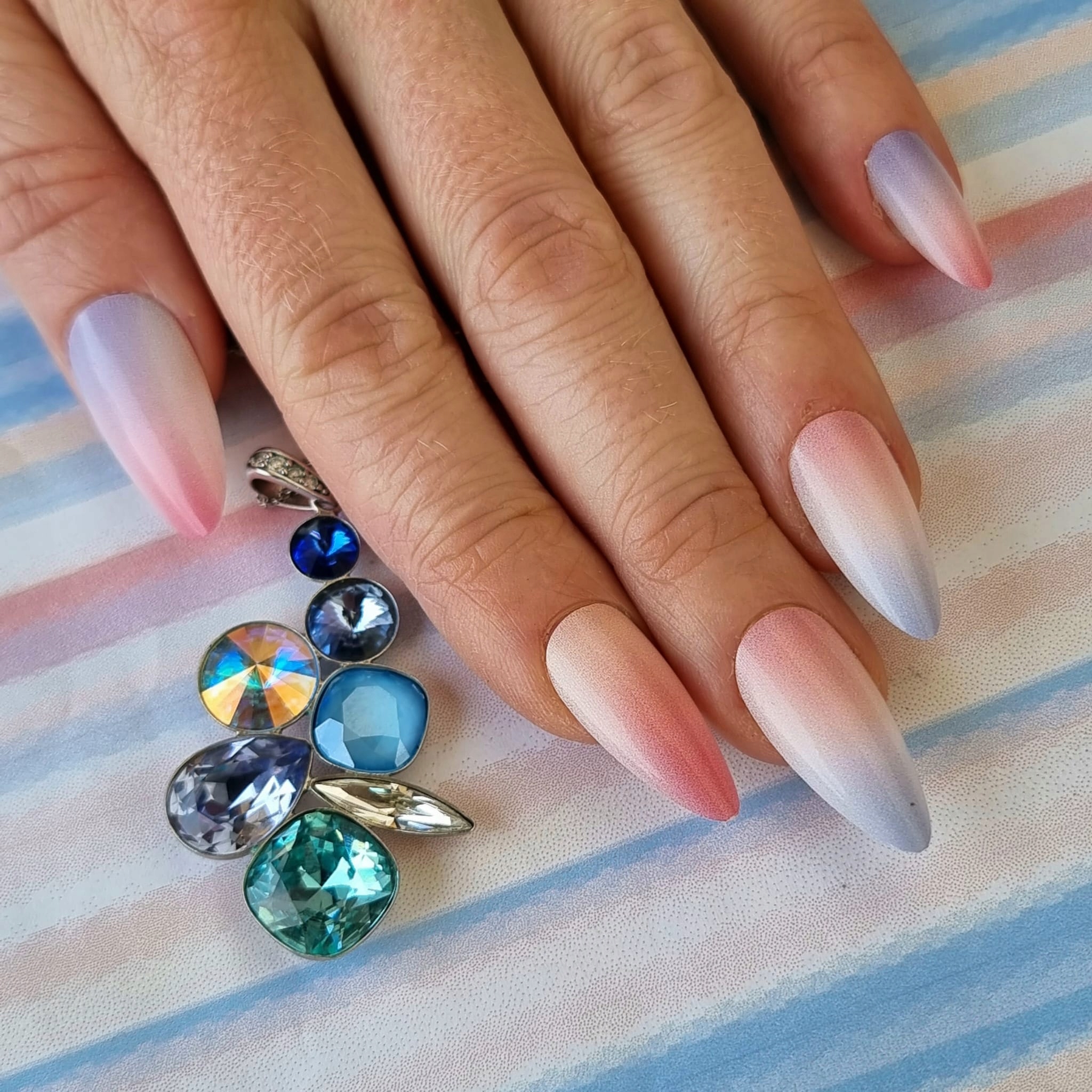 ✔️Выбранная модель выполнена в красивом блестящем розово-фиолетовом цвете. цвет синий, форма шпилька, с эффектом омбре.