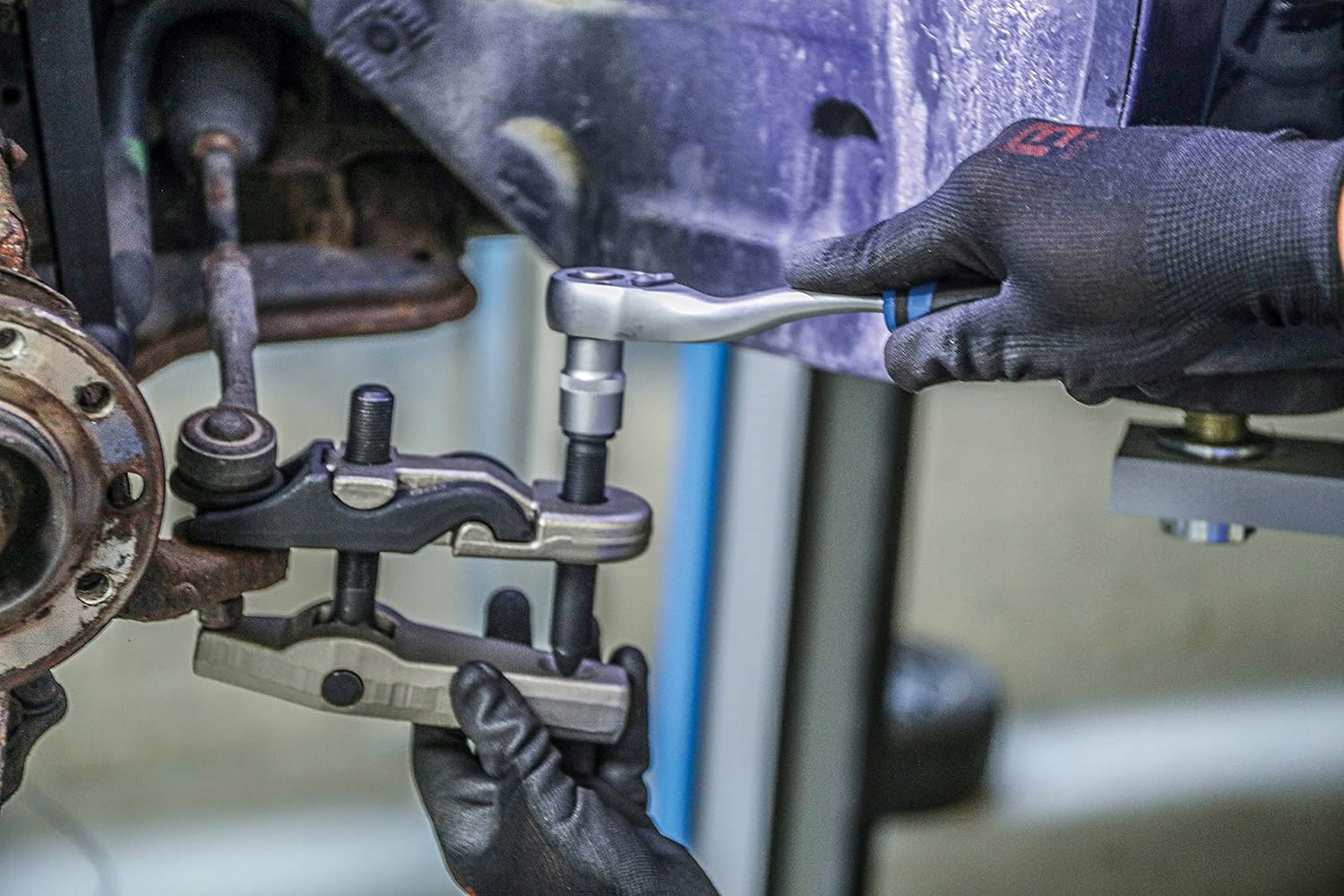 Специализированный набор, адаптированный для демонтажа шаровых суставов в различных размерах в легковых автомобилях, автобусах и внедорожниках с быстрой возможностью замены челюстей другим размером.