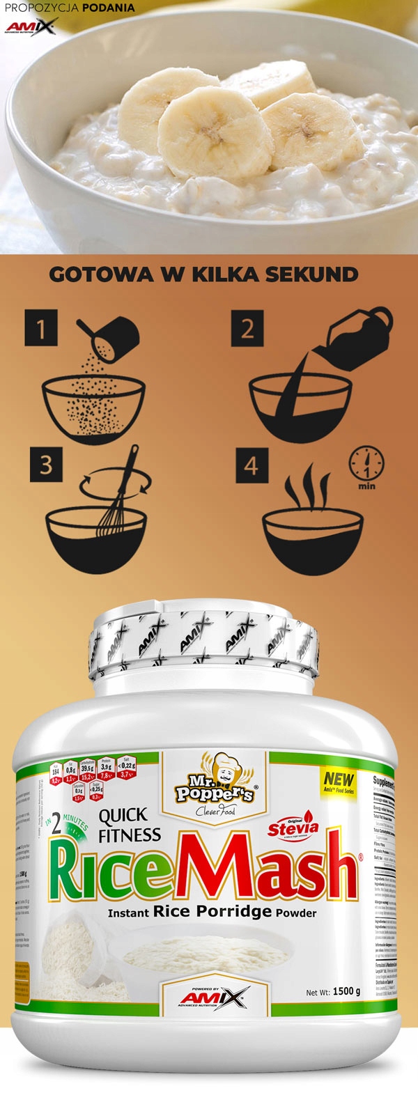 Овсянка быстрого приготовления сладкая как продукт повседневного питания, идеальна в качестве дополнения к блюдам, благодаря чему вы можете улучшить свои рецепты или изменить их характер и позаботиться о своем здоровье. Начните использовать Rice Mash Mr. Popper's для приготовления завтраков или перекусов, которые в сочетании, например, со свежими фруктами, медом, орехами или йогуртом - изменят ваше питание к лучшему!