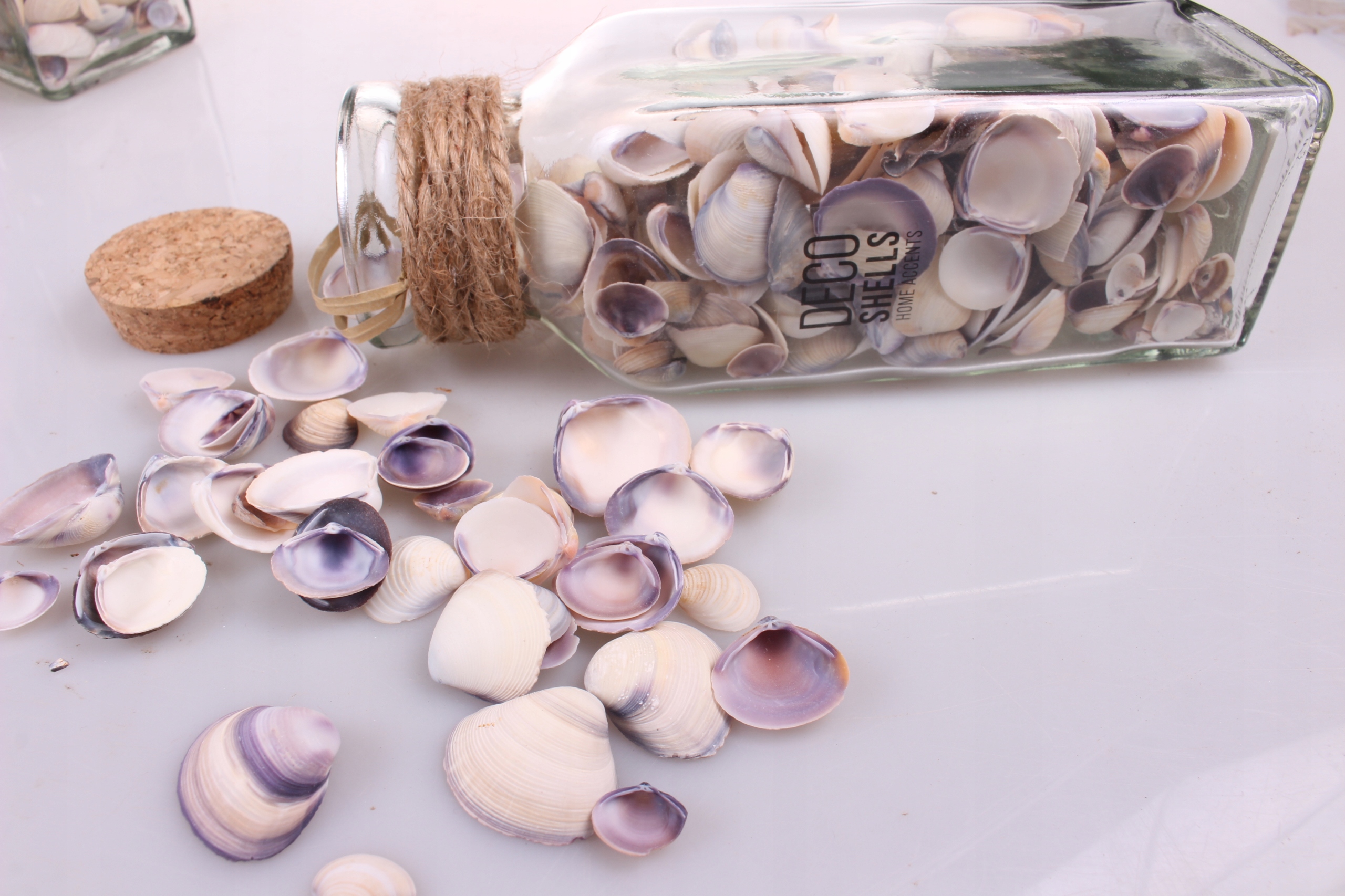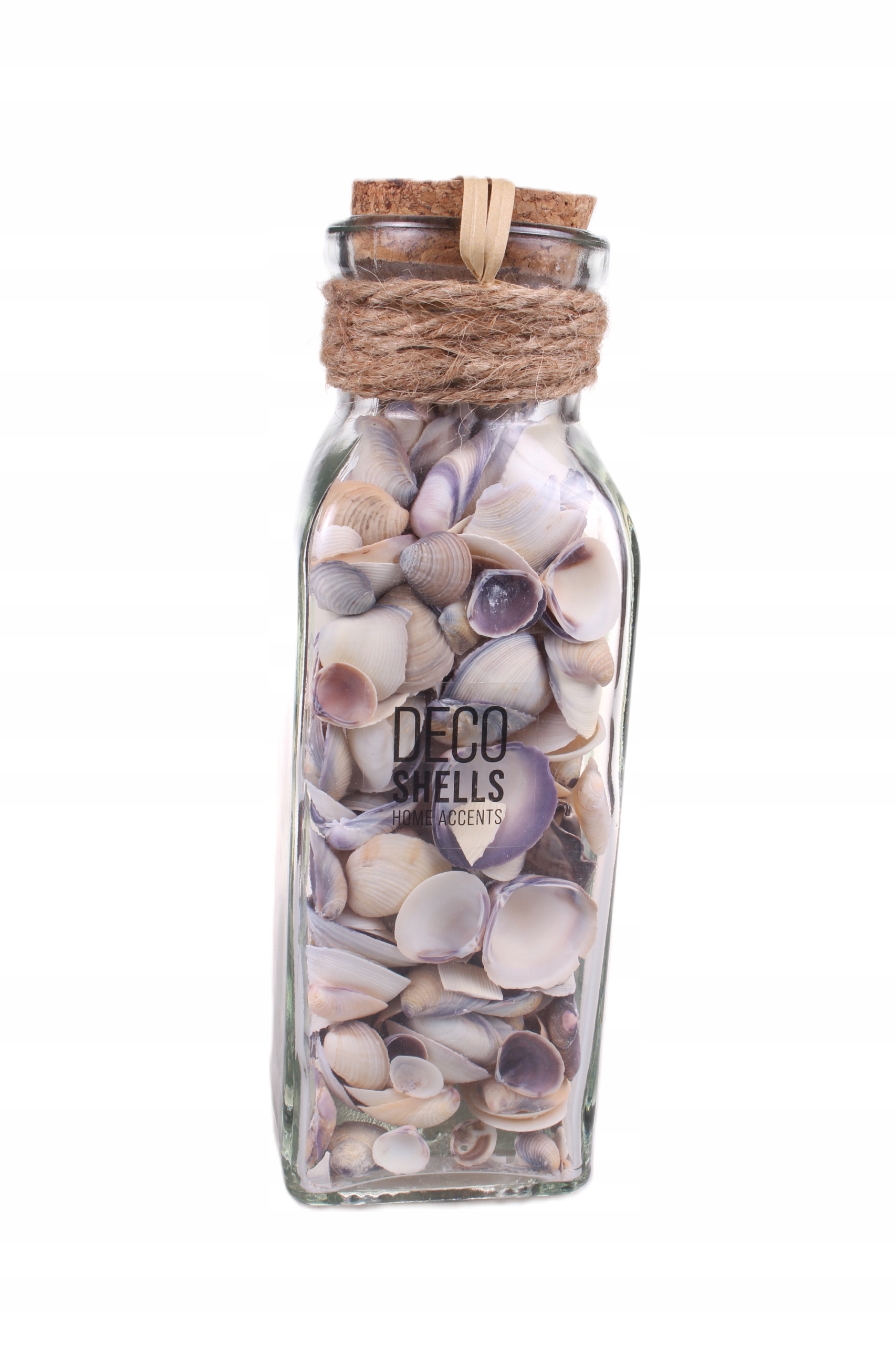 Naturalne muszle morskie szklanej butelce fioletowo niebieskie DECO SHELLS
