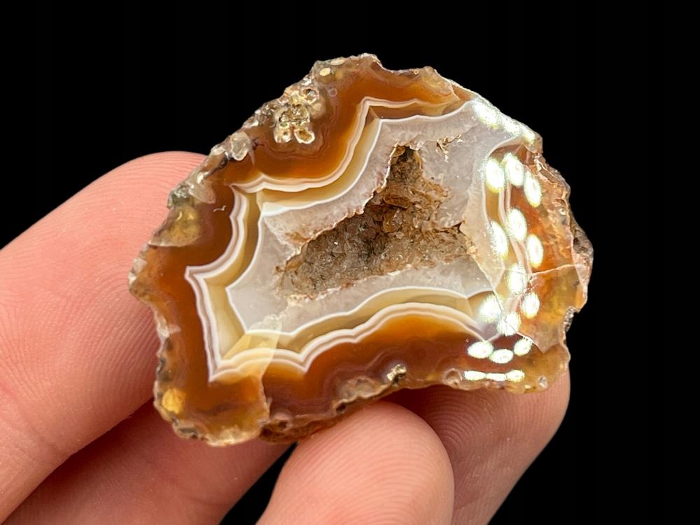 Агаты - их название происходит от реки Ахат, сегодняшнее название Дирилло с юга Сицилии, их добывали там в древности. Это полудрагоценный минерал, разновидность халцедона, сформированный в разноцветные ленты. Он образуется в пустотах горных пород, называемых жеодами. В результате процессов многократного выделения кремнезема из растворов или циклического осаждения пигмента в силикагеле создаются чередующиеся разноцветные слои самого разного цвета. Твердость агатов составляет 6,5 – 7 по десятибалльной шкале MOHSA. Предлагаемый экземпляр был найден в Малави.
