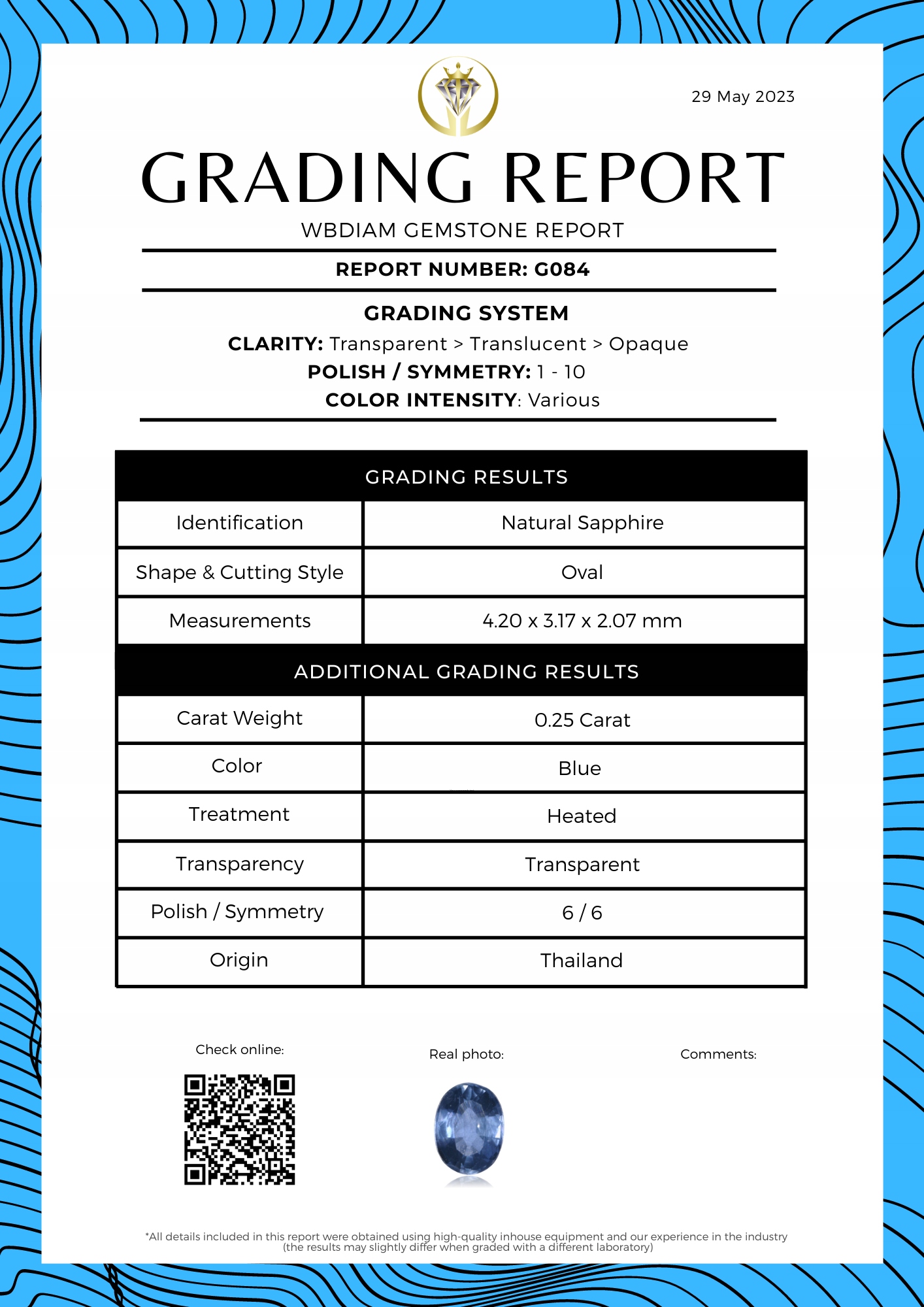 Сертифицировано WBDIAM - НОМЕР ОТЧЕТА: G084 - сертификат доставлен в цифровом виде (PDF)