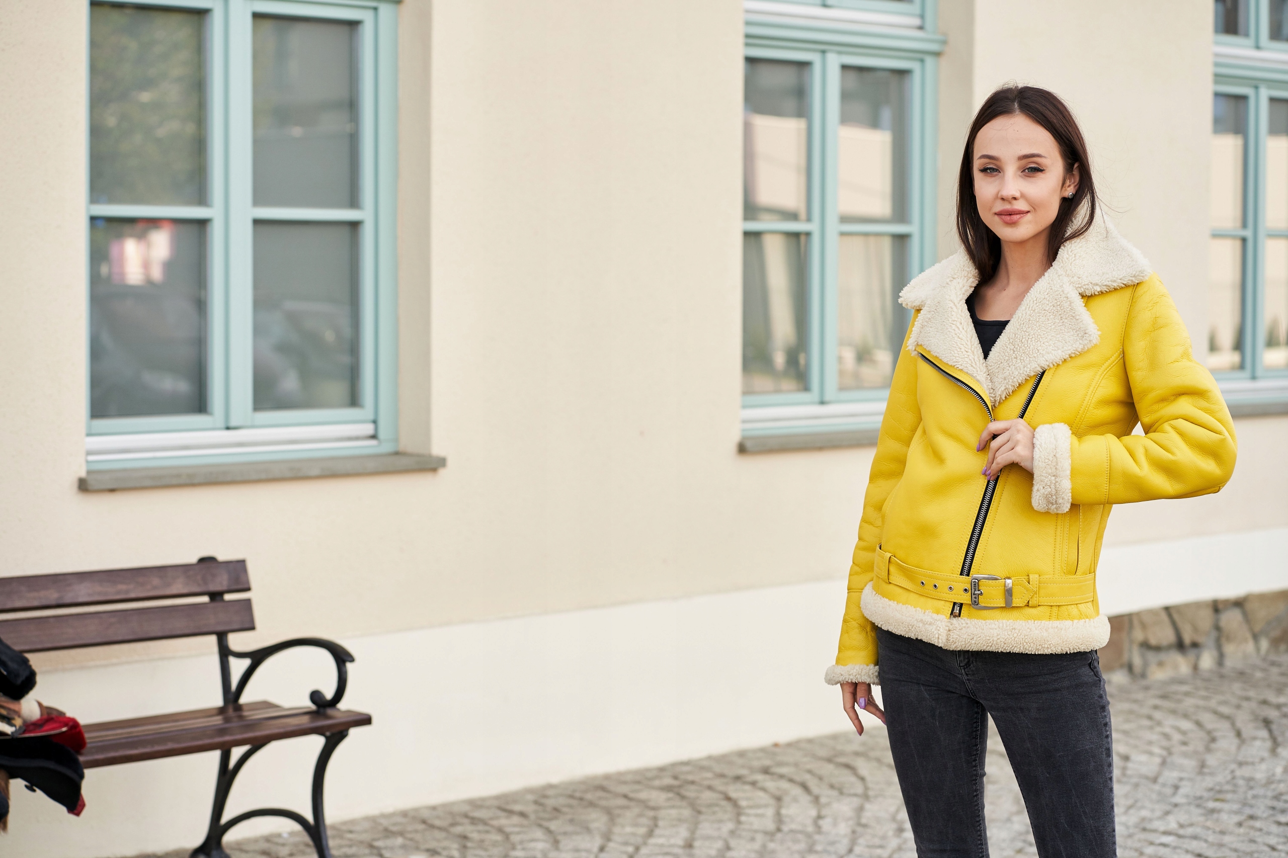 Naturalny KOŻUCH damski ciepła KURTKA zimowa pilotka skórzana z futrem