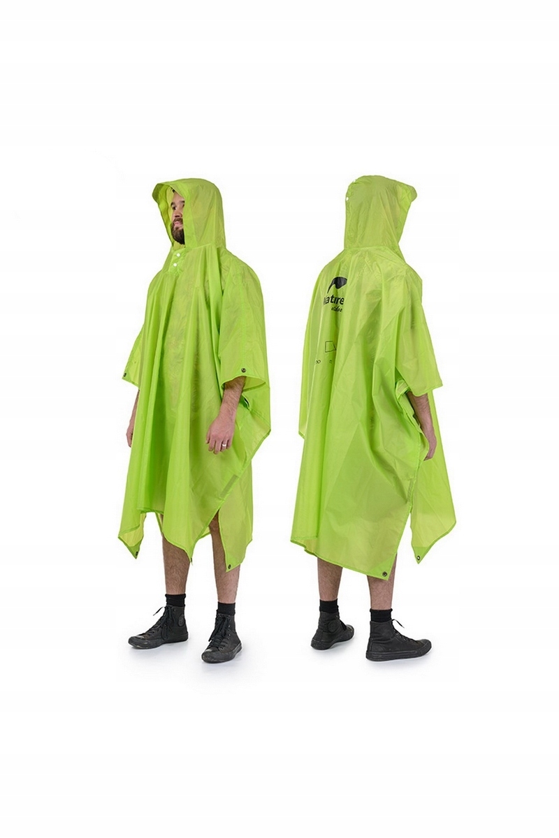 Плащ из полиэстера от Naturehike, который можно носить поверх рюкзака. Он легкий и просторный, поэтому не займет много места в рюкзаке. Оснащен капюшоном с усиленным козырьком, который также защищает лицо от дождя. Под шеей имеются кнопки, а под мышками - липучки.