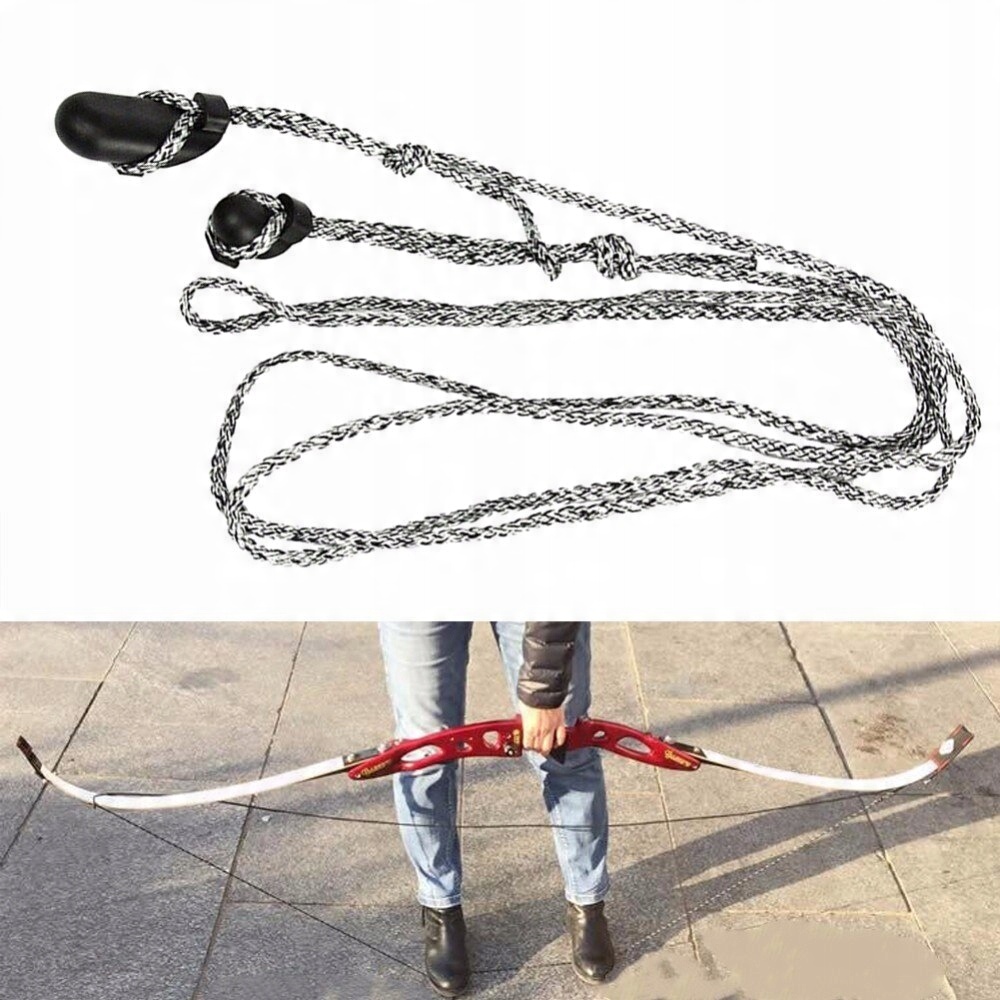 Использование натяжителя струны — это простой и безопасный метод надевания тетивы на лук. Тетива состоит из длинного шнура с одним кожаным карманом и специальной ручки, которая крепится к дужке лука.
