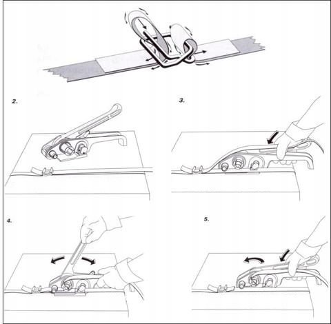 Оснащен перфорированным зажимом ленты, предотвращающим соскальзывание ленты при натяжении, и механическим ножом, разрезающим ленту после натяжения. .