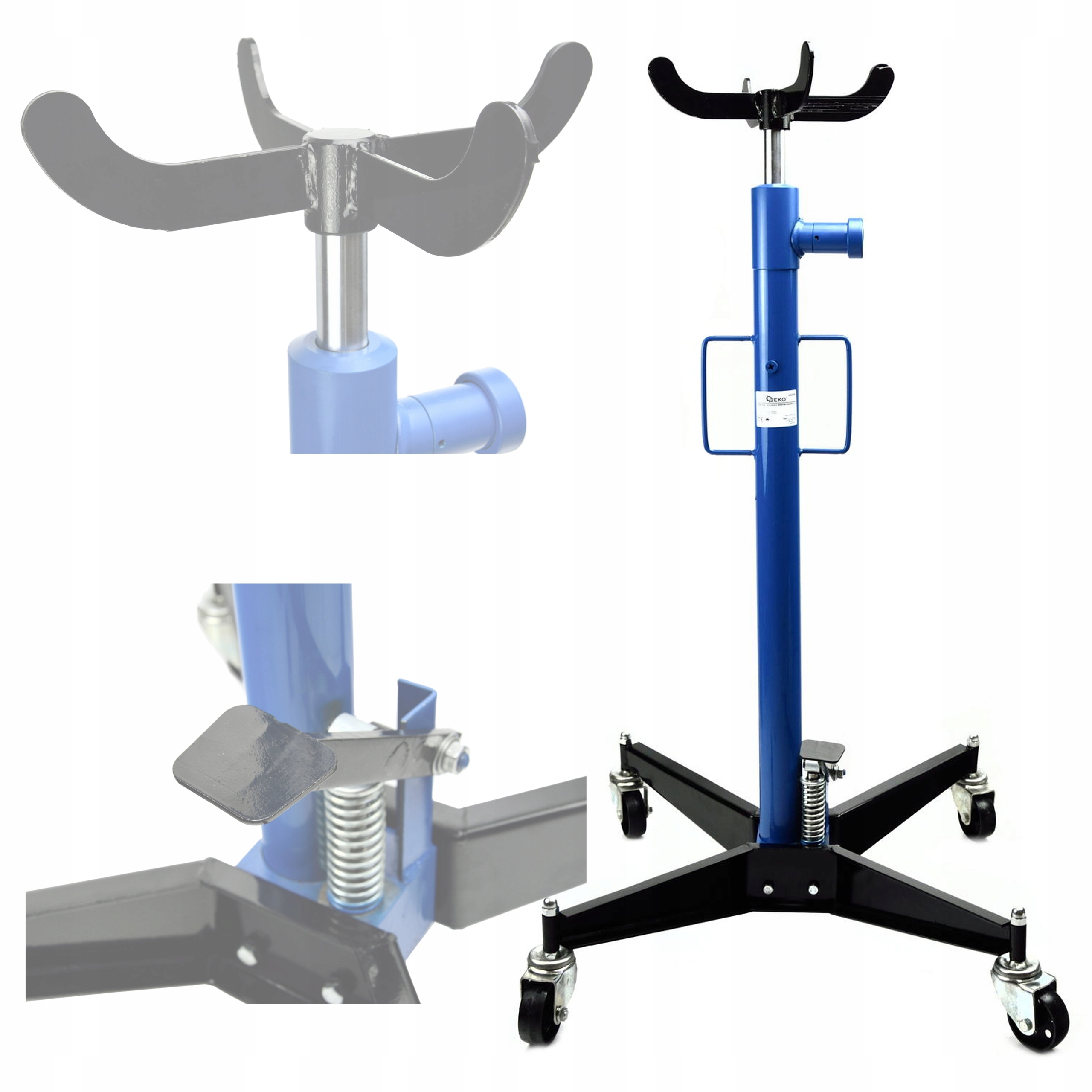 Домкрат для подъема коробки передач или двигателя. Подъемник оснащен четырьмя самовыравнивающимися колесами, обеспечивающими легкое и стабильное перемещение. Устройство используется в мастерских, гаражах или везде, где при работе требуется большая грузоподъемность.