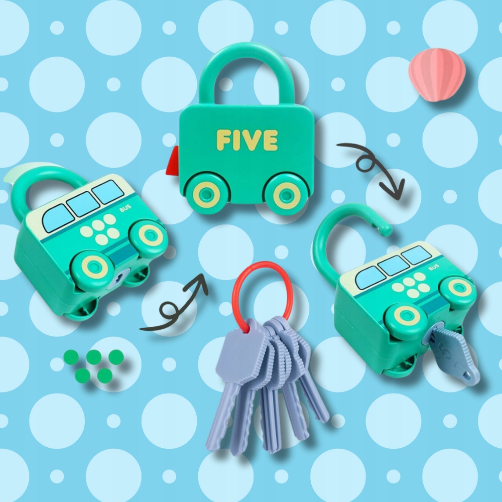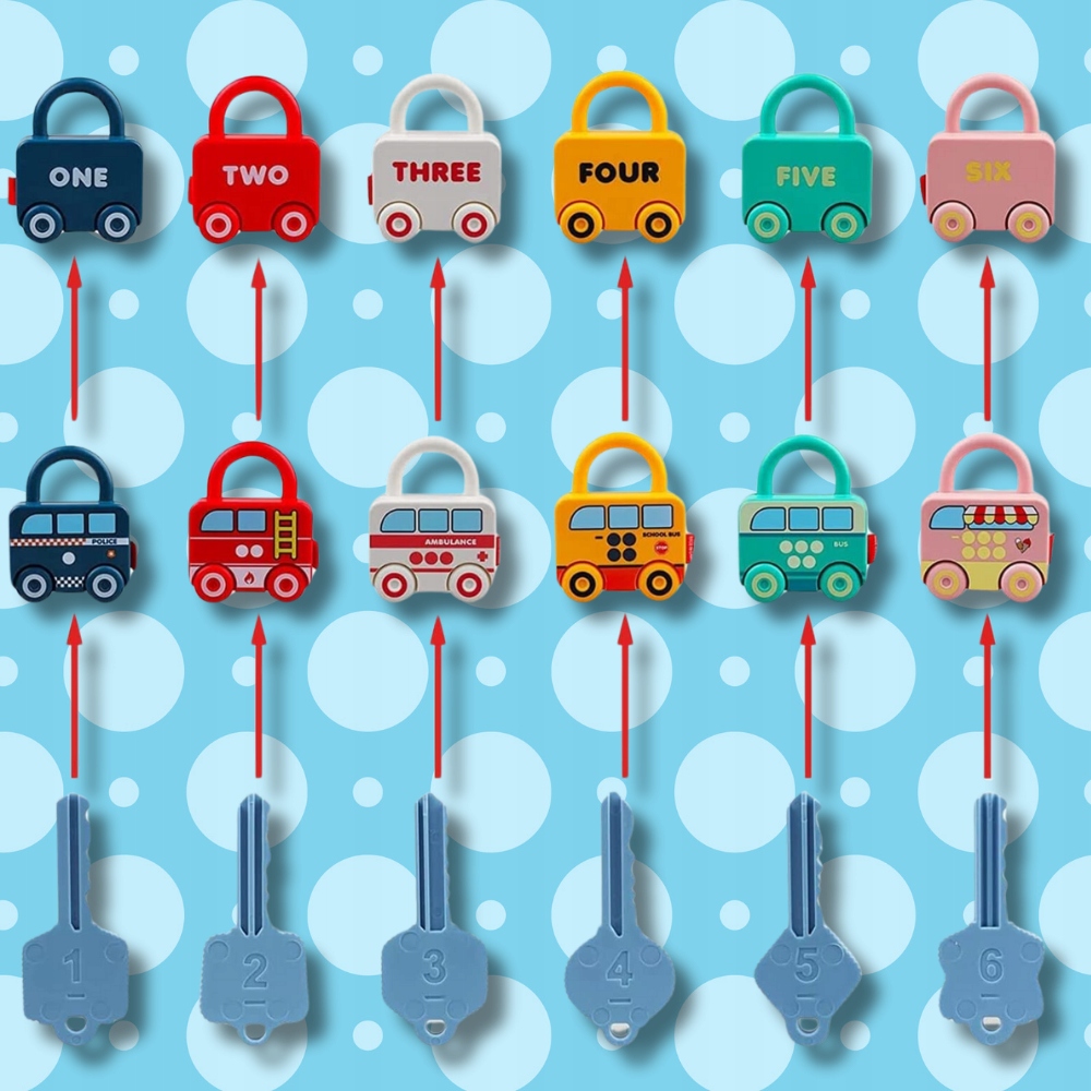 Ключ прикреплен к каждой машине, которую ребенок должен соответствовать, чтобы разблокировать замок. Ключи имеют разные размеры, которые вводят дополнительный элемент задачи. h2>