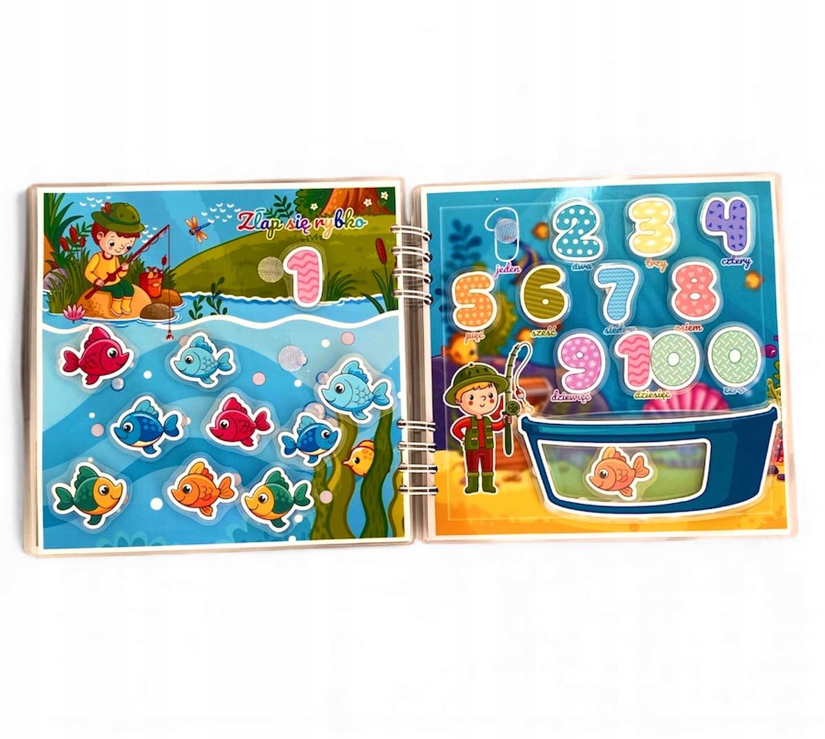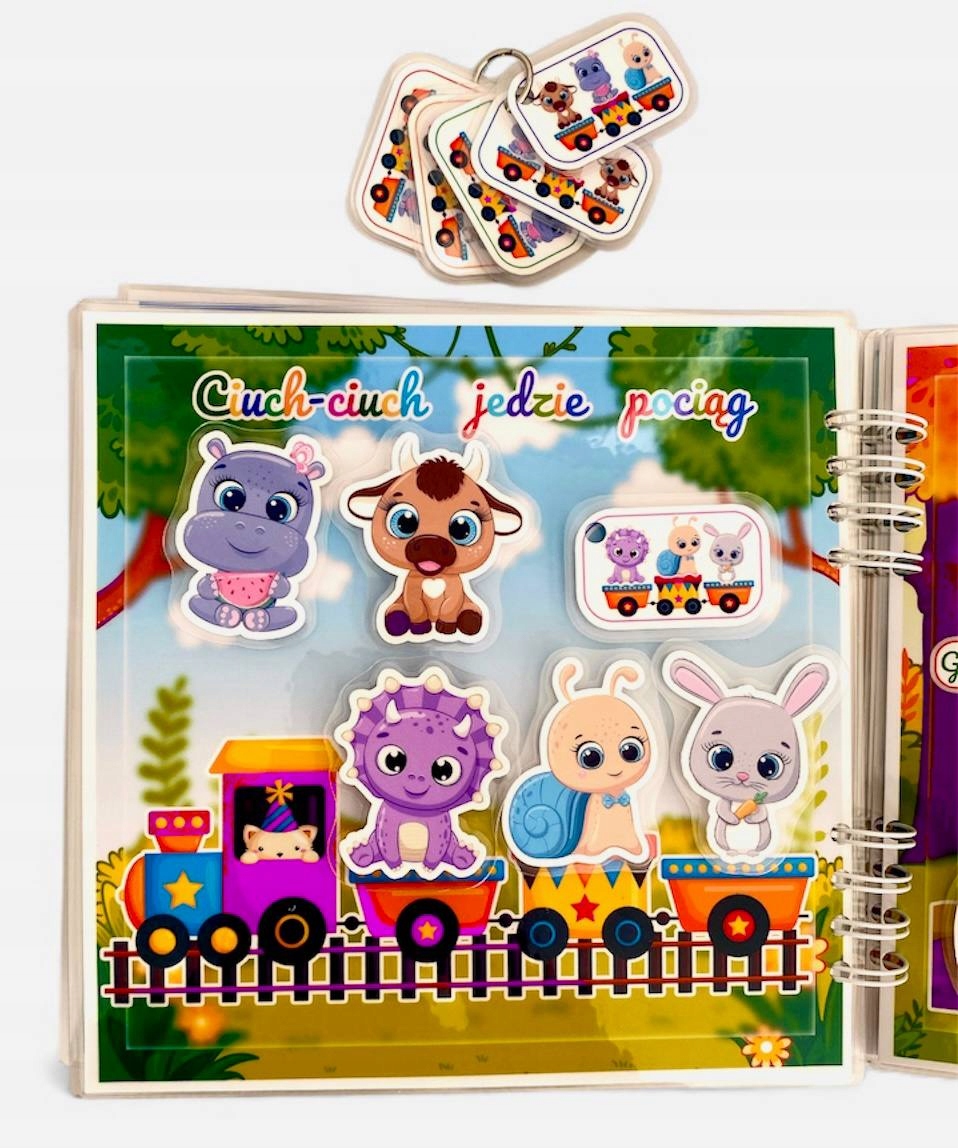 Книга изготовлена ​​из жестких, прочных карточек, которые идеально подходят для маленьких ручек. Имеет спиральный переплет, который облегчает перелистывание страниц и предотвращает их быстрое разрушение. Кроме того, в комплект входят вешалки/мини-карты, которые можно использовать как элемент игры или обучения.