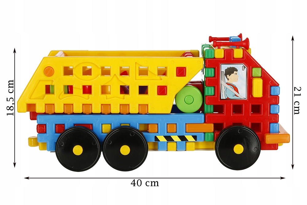 - Набор содержит красочные блоки, соединительные и декоративные элементы, из которых собирается самосвал