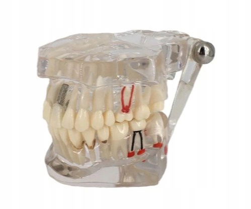 На прозрачной модели показаны верхняя и нижняя челюсти взрослого пациента, соединенные шарнирным соединением, позволяющим смыкать верхнюю и нижнюю зубные дуги. Модели зубов включают мост Мэриленд, кариес, зубной камень, кисту, 3 имплантата, заболевание.