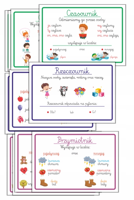 В наборе 11 односторонних фольгированных досок формата А4 с пояснениями к отдельным частям речи - глаголу, существительному и прилагательному.