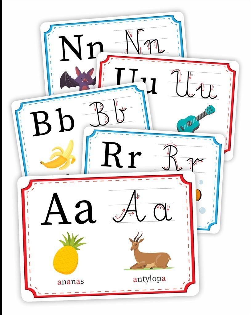 На каждой карточке набора есть по 2 картинки, присвоенные определенной букве, - это облегчит ребенку изучение и запоминание букв.