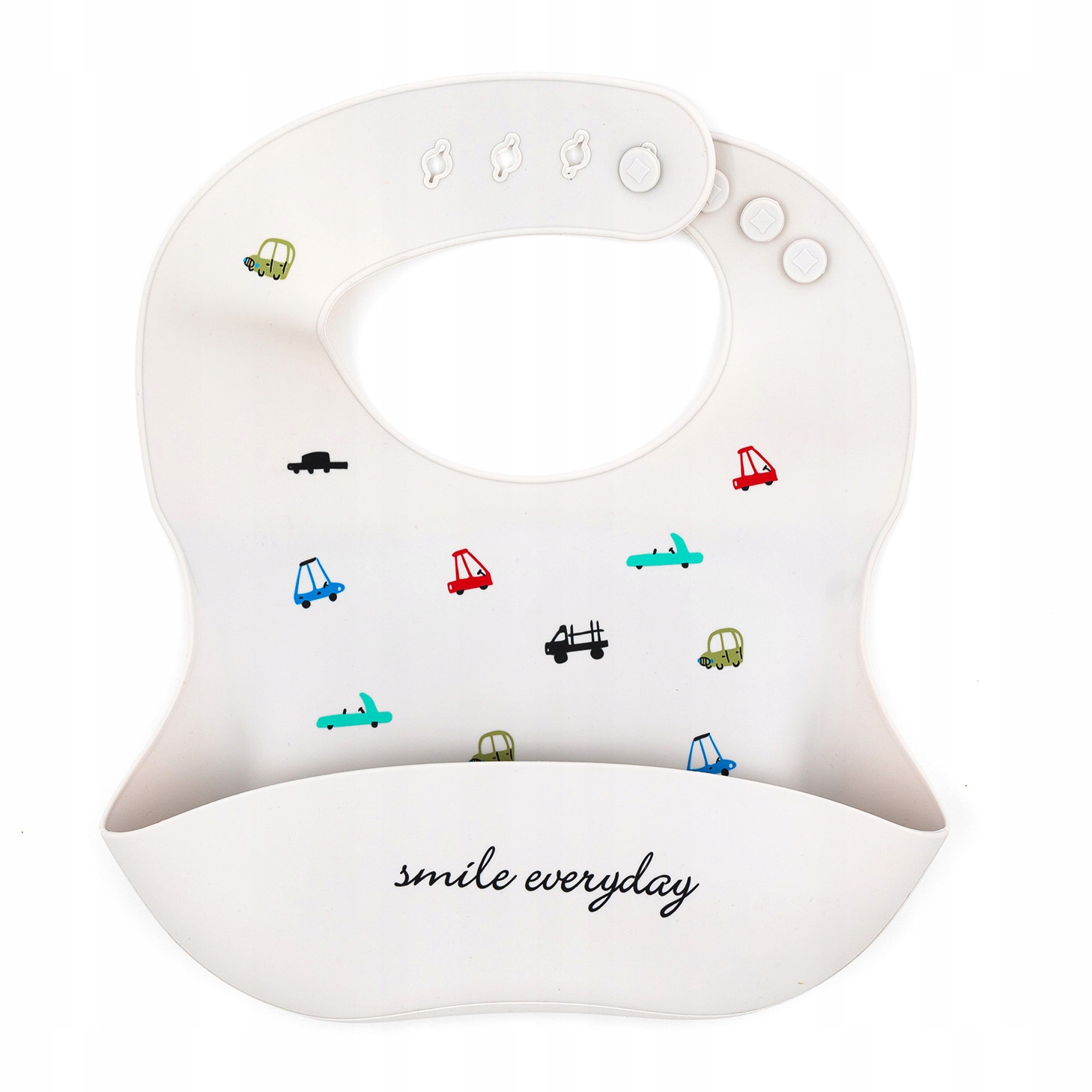 Он гибкий, легкий и изготовлен из безопасного, гипоаллергенного и устойчивого к разрушению силикона. Внизу, по всей ширине, он заканчивается профилированным карманом для падения пищи. Удобный крепеж для силиконовых «кнопок» имеет регулируемую ширину, благодаря которой он не повредит и не ограничивает движения ребенка и в то же время держит нагрудник в нужном месте. Свобода передвижения также обслуживается профилированными сторонами нагрудника.