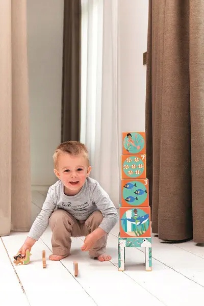 Красочная башня из блоков с пятью кубиками в разных размерах. Набор включает в себя деревянные фигурки: две сирены, кит. Ребенок предназначен для установки пирамиды с 5 кубами, начиная с самой большой, чтобы создать логическую строку, состоящую из изображений.