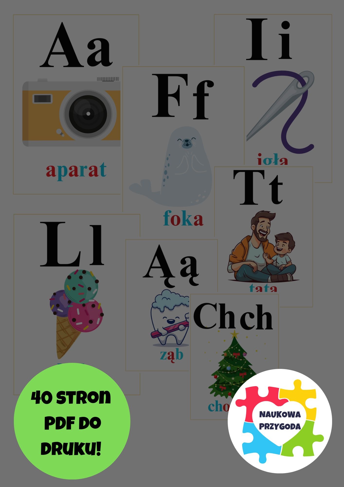 Набор "Доски - Буквы" от Naukowa Adventures представляет собой прекрасно подготовленный набор развивающих карточек представляющий весь алфавит - от А до Ż, с польскими знаками и звуками. Каждая буква представлена иллюстрацией и подписью, что облегчает обучение чтению и распознаванию букв.