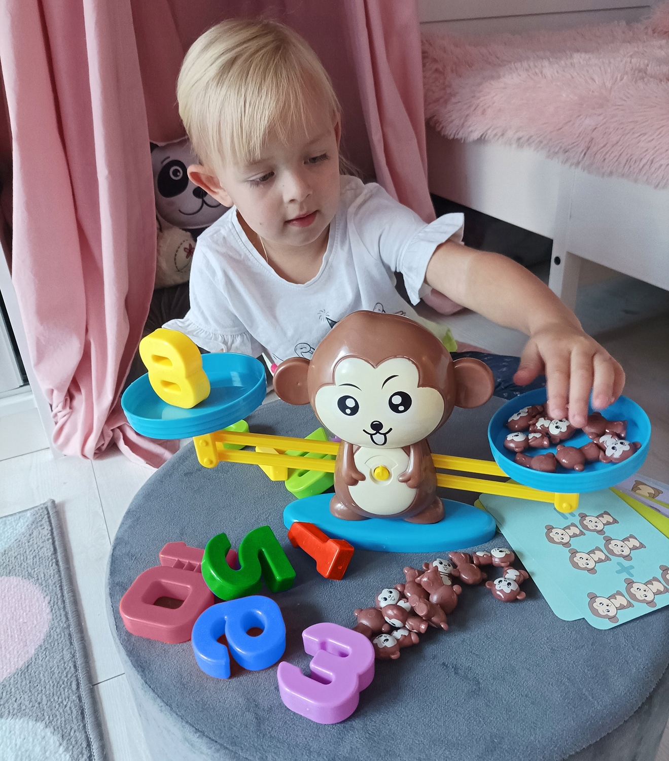 Обезьянка, выполняющая роль весов, является центральным элементом набора. Каждое число имеет свой вес, который соответствует весу фигурок монстров. Ребенок должен сопоставить число на карточке с соответствующим весом, что поможет ему понять, как оно работает, и научиться считать.