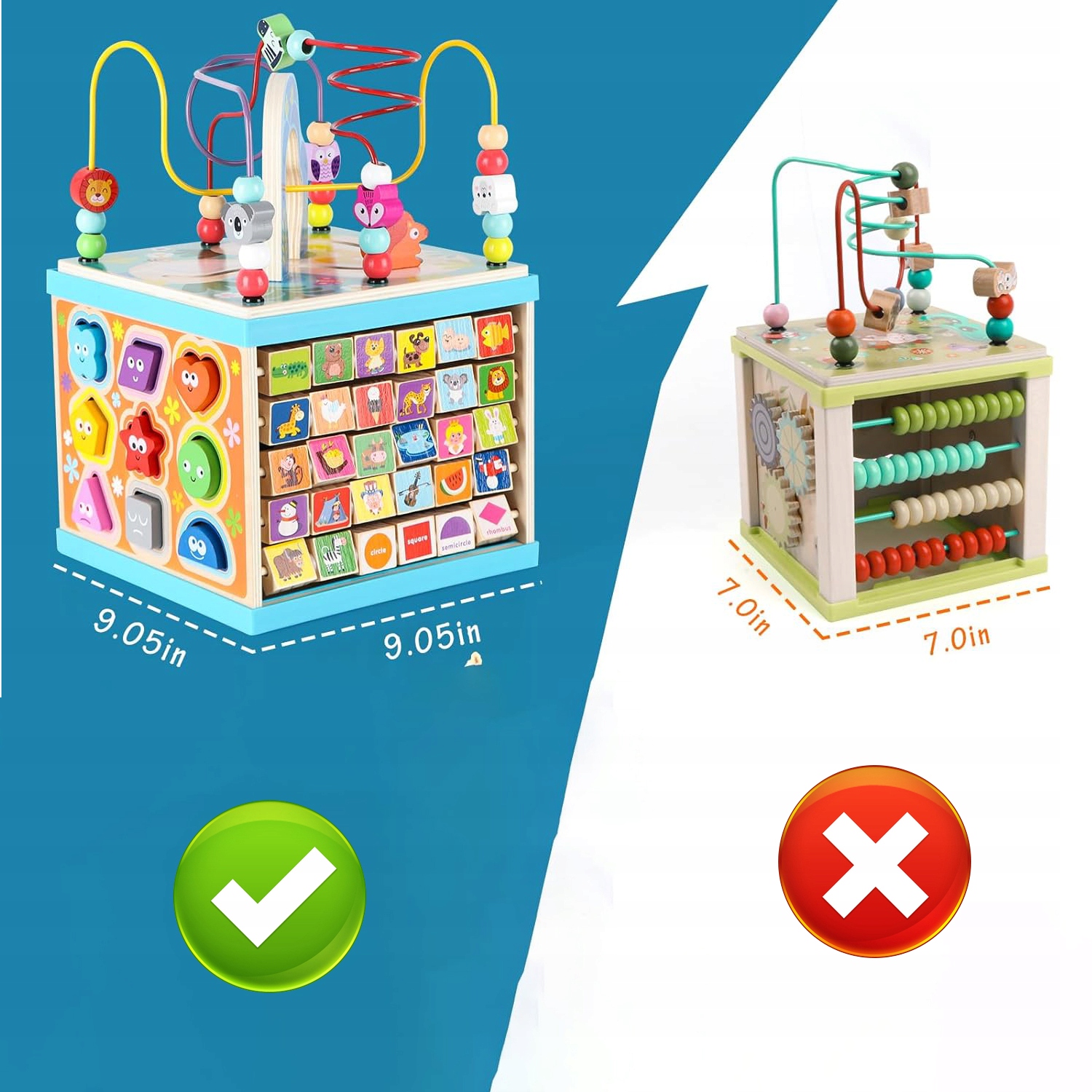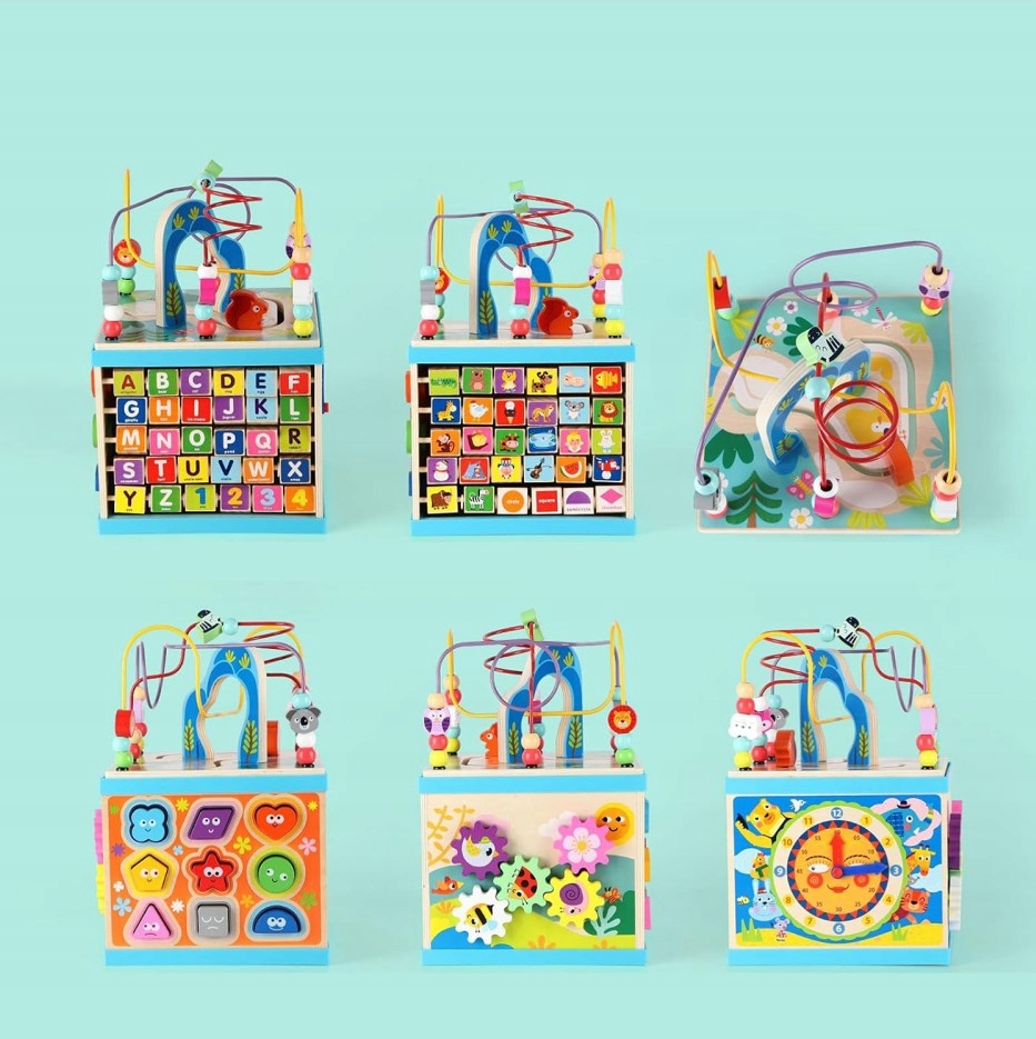 Этот игровой кубик имеет 5 различных игровых сторон, включая вращающееся оборудование для радуги, счеты ABC-123, лабиринт из бисера, сортировщик фигур и часы. Он тренирует зрительно-моторную координацию, мышцы рук и мелкую моторику ребенка.