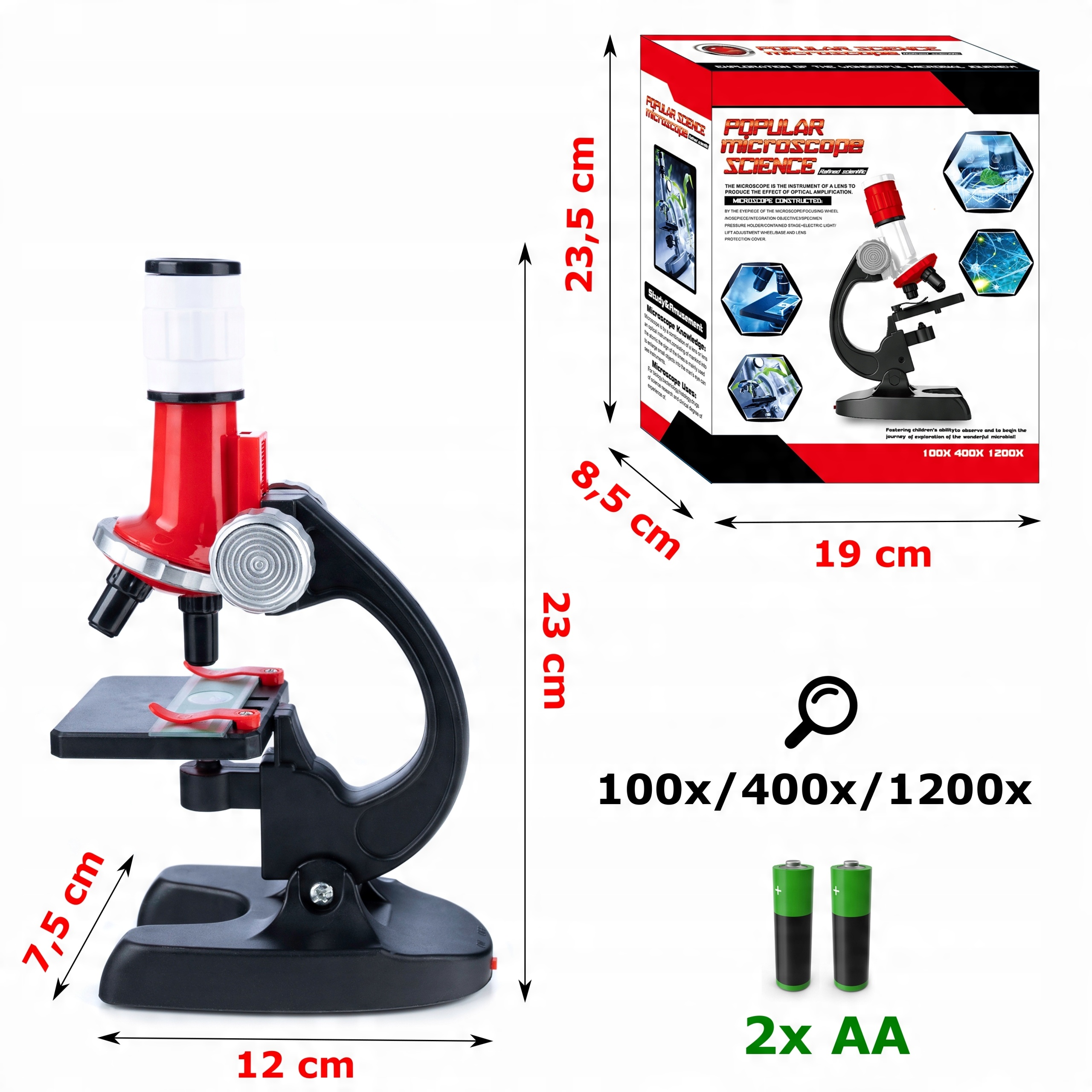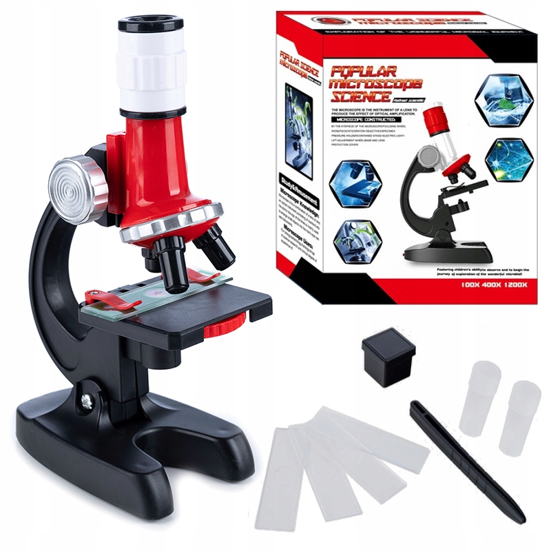 УЧЕБНО-НАУЧНЫЙ МИКРОСКОП ДЛЯ ДЕТЕЙ - УВЕЛИЧЕНИЕ 100x/400x/1200x - СО СВЕТОДИОДНОЙ ПОДСВЕТКОЙ, НА АККУМУЛЯТОРЕ + АКСЕССУАРЫ