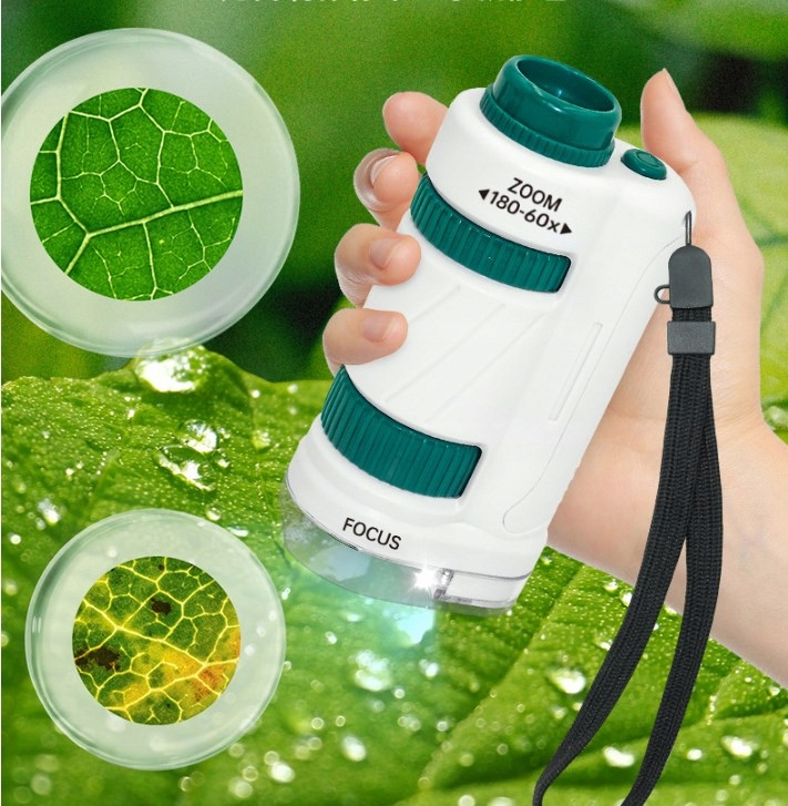 доступны различные увеличения, до 60x и 180x b>, что позволяет детям наблюдать за структурой листовых клеток, обнаруживает тонкую текстуру крыльев насекомых и испытывает чудеса микроскопического мира.