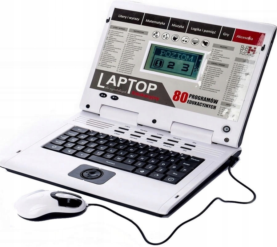 Обучающий и многофункциональный ноутбук от HH Польша – универсальное устройство для самых маленьких. Имеет множество функциональных программ, которые помогут развивать навыки и знания ребенка. Все очень стильно и внешним видом напоминает настоящую Ноутбук. Ноутбук имеет 80 развивающих и развлекательных программ, тренирует память, логическое мышление и слух b> ребенка. Преподает польский язык, решая математические и логические задачи. Он научит вашего ребенка полезным навыкам: чтению времени и установке будильника. Содержит музыкальные игры. Кроме того, он имеет интересное > аркадные игры.