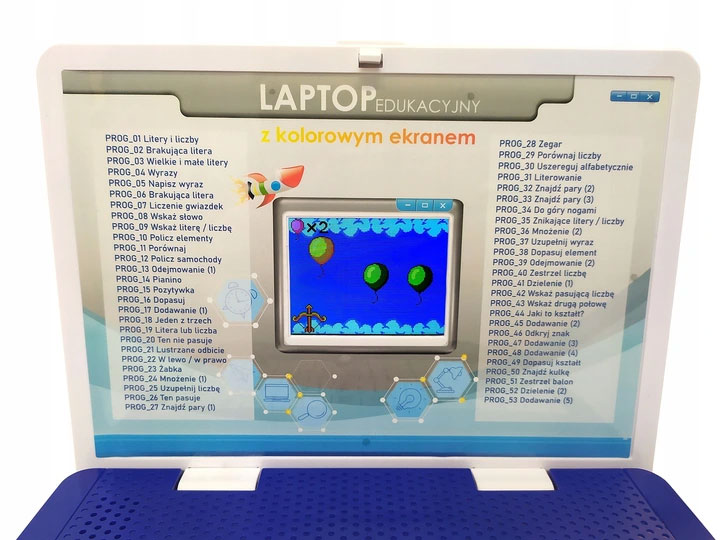 Мой Ноутбук обучающий и многофункциональныйс цветным дисплеем — универсальное устройство для самых маленьких. Он имеет ряд функций, которые помогут развивать навыки и знания ребенка. Все это очень стильно и выглядит как настоящий ноутбук. Этот невероятно реалистичный детский компьютер с цветным дисплеем и звуком на польском языке станет прекрасным подарком ребенку от 3 до 7 лет. Оно не только тренирует память вашего ребенка и научит его буквам, но также поможет ему освоить способность решать основные математические и логические задачи. Память устройства содержит 53 обучающие программы, музыкальные игры и аркадные игры.