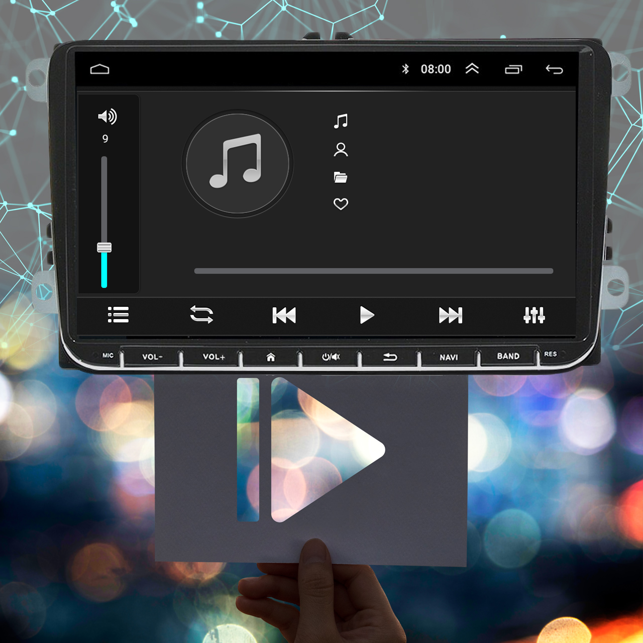 Радиоплеер на базе системы ANDROID 10 оснащен модулем GPS (навигации), модулем WiFi, сенсорным ЖК-дисплеем с Диагональ 9 дюймов и разрешение 1024x600 пикселей, 2x USB-входа. Магнитола, помимо прочего, имеет вход для камеры заднего вида. Для обеспечения безопасности во время движения установлен модуль Bluetooth, позволяющий разговаривать, не отрывая рук от руля. Модуль поддерживает, среди прочего, протокол A2DP, который позволяет передавать музыкальные файлы с подключенного смартфона. При подключении смартфона к магнитоле с помощью USB-кабеля магнитола активирует функцию MirrorLink, которая копирует экран смартфона на магнитолу.