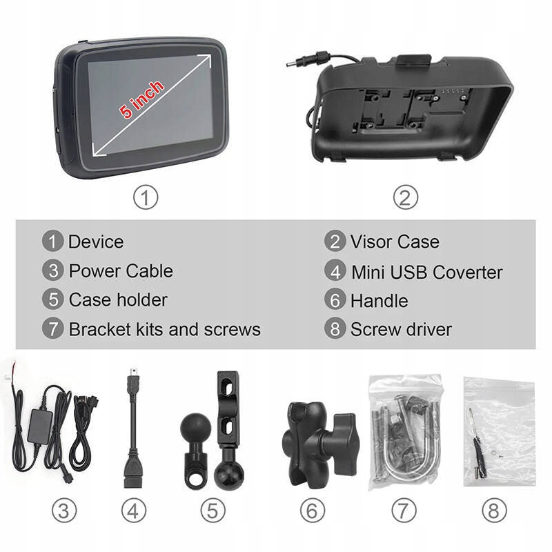 В комплект входит:монитор 5" Корпус монитора с защитой Блок питания 12 для стационарной установки USB-кабель Кронштейн для крепления на руль или под зеркало Шаровой шарнир Крепежные аксессуары (2 размера) подков на руль) Отвертка * Возможен монтаж навигационной системы в т.н. головная трубка. Держатель доступен на других наших аукционах и отмечен моделью: BM2R