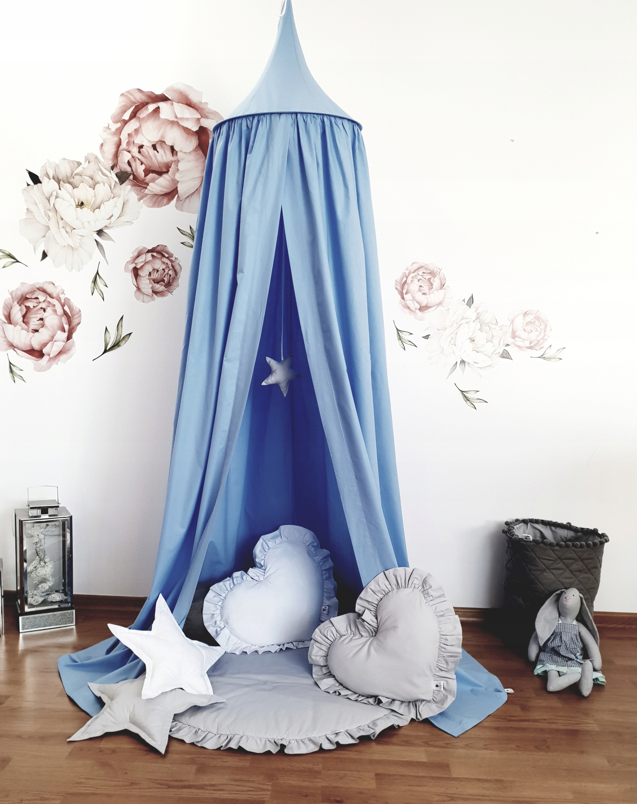 Балдахин – чрезвычайно эффектное украшение детской комнаты, места для игр и отдыха. Подвешенный над детской кроваткой, он приглушит шум и защитит от лишнего света, а в дальнейшем послужит зоной игры и отдыха в комнате дошкольника. Идеально подходит для небольшой комнаты, поскольку не занимает много места. Внутри верха можно прикрепить украшения и декоративные светильники.