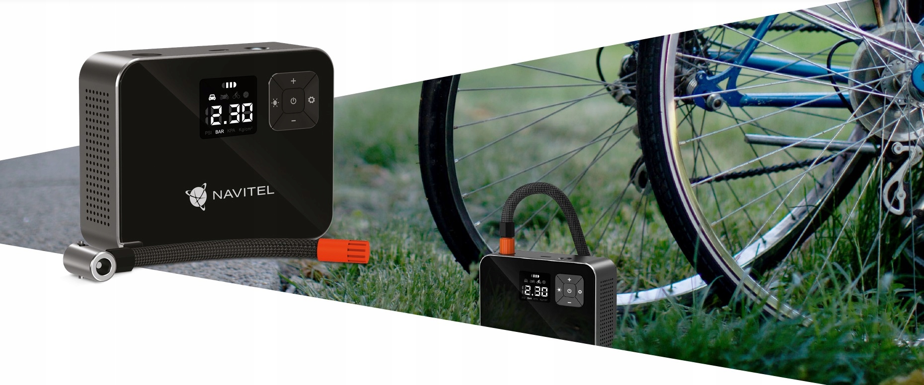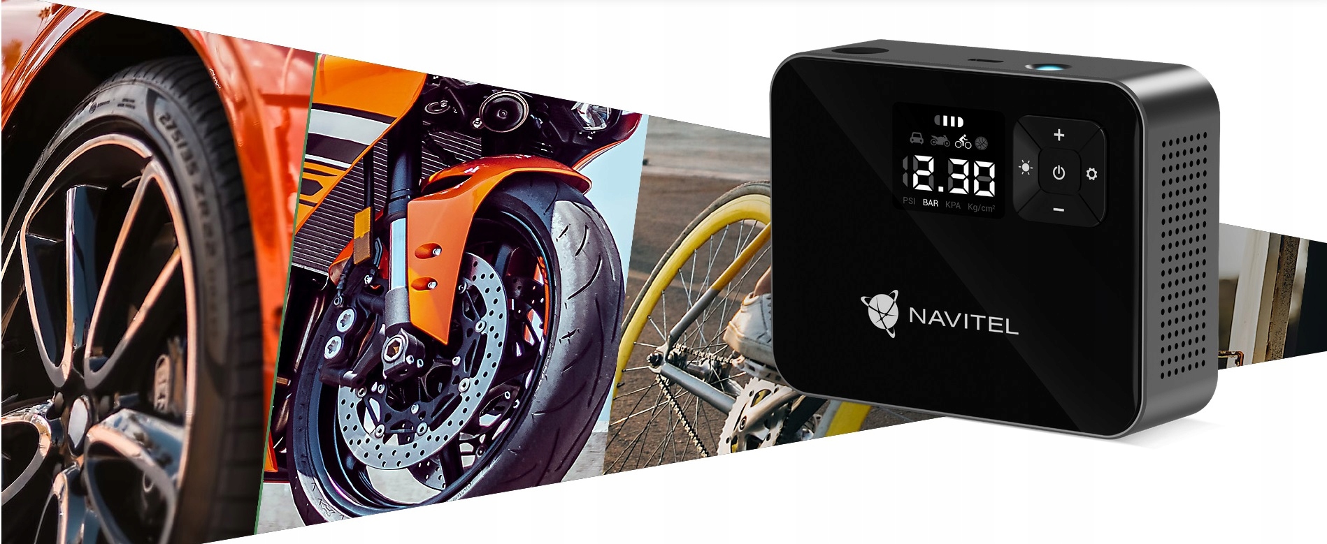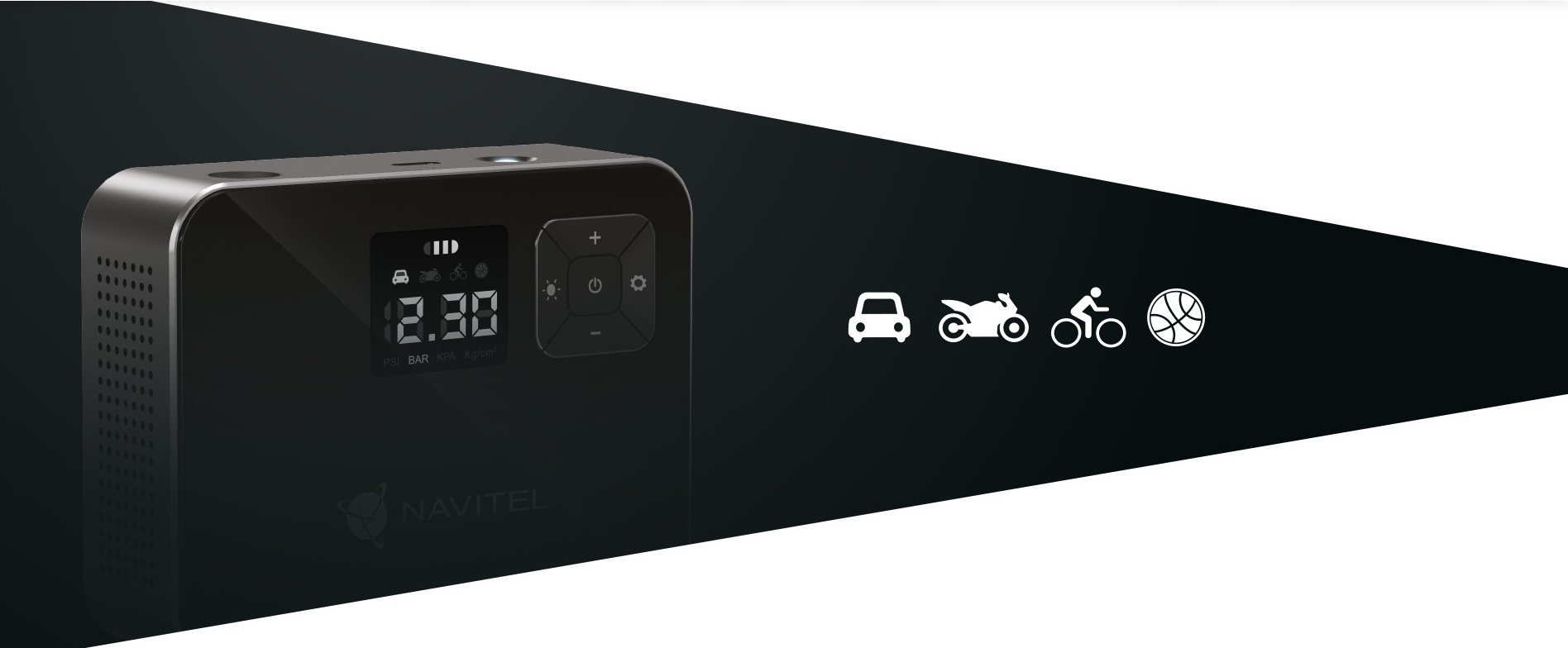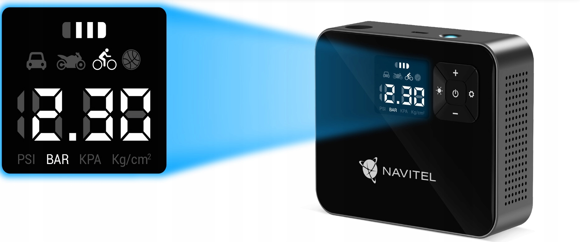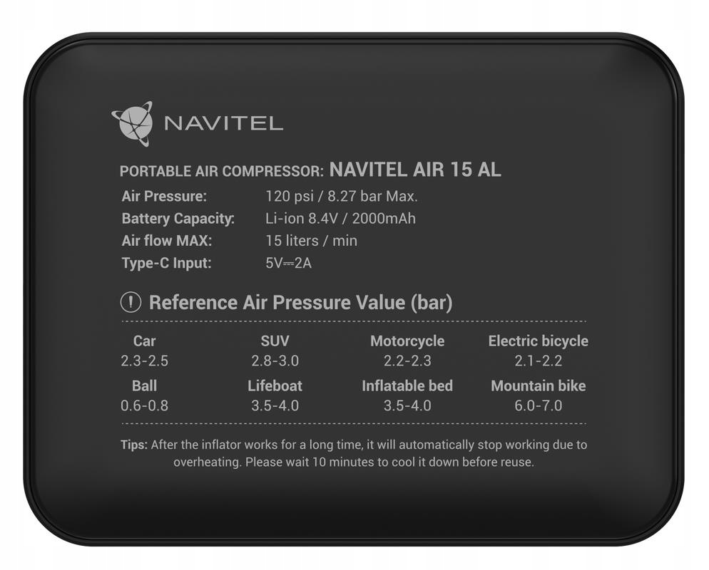 NAVITEL AIR 15 AL — воздушный компрессор с питанием от аккумулятора, автоматическим регулятором давления, цифровым манометром и ЖК-дисплеем. AIR 15 AL позволяет легко накачивать шины автомобиля, велосипеда, мотоцикла, мяча или игрушки для плавания. Благодаря встроенному Li-ion аккумулятору емкостью 2000 мАч компрессор работает автономно – без необходимости подключения к электрической розетке или бортовой сети автомобиля.