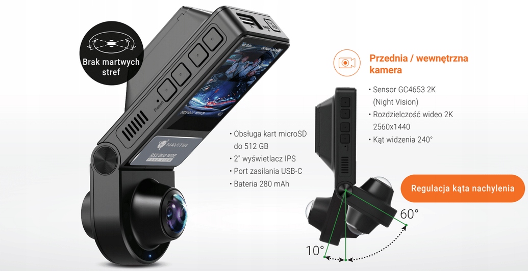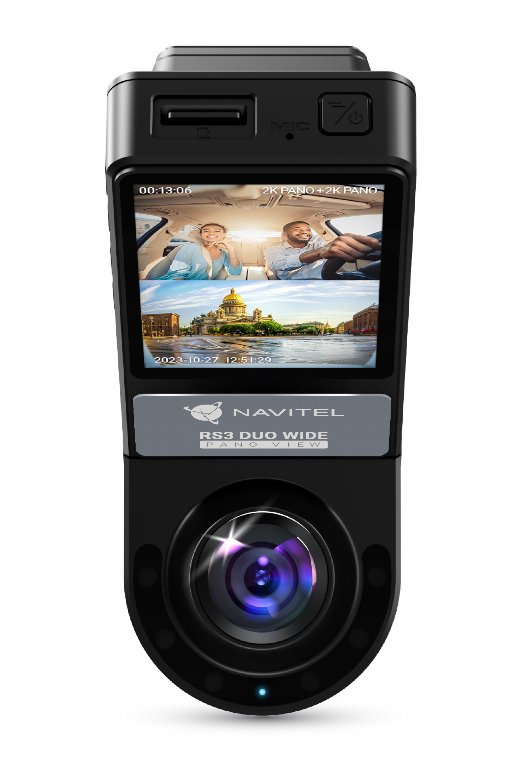 NAVITEL RS3 DUO WIDE — инновационный видеорегистратор с двойной камерой 2К, обеспечивающей полный обзор 480°, ночную запись, IPS-экран, поддержку карт microSD до 512 ГБ и множество других функций.