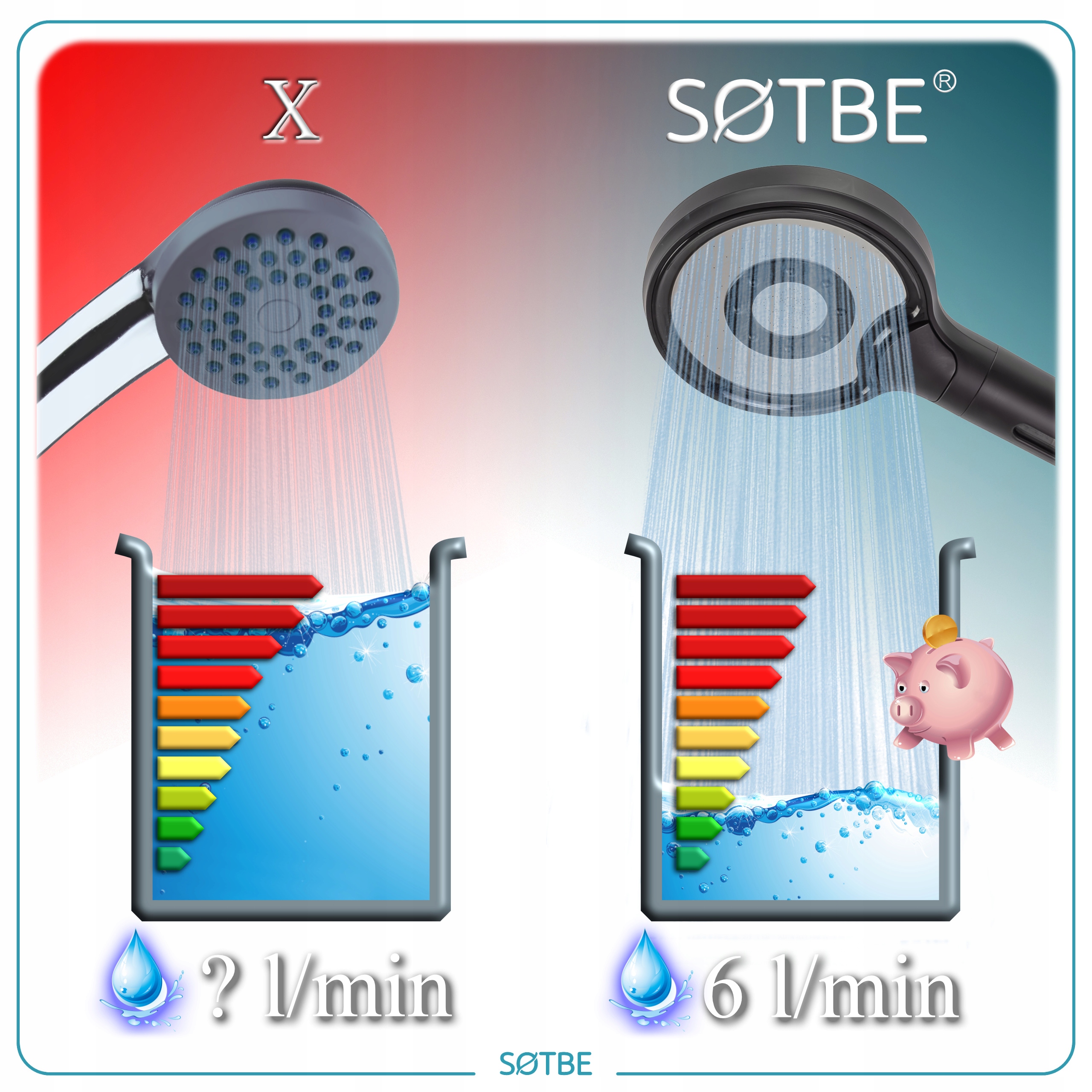 - Эффективность — наша насадка для душа использует всего 6 литров воды, что на 60 % меньше, чем стандартные модели.