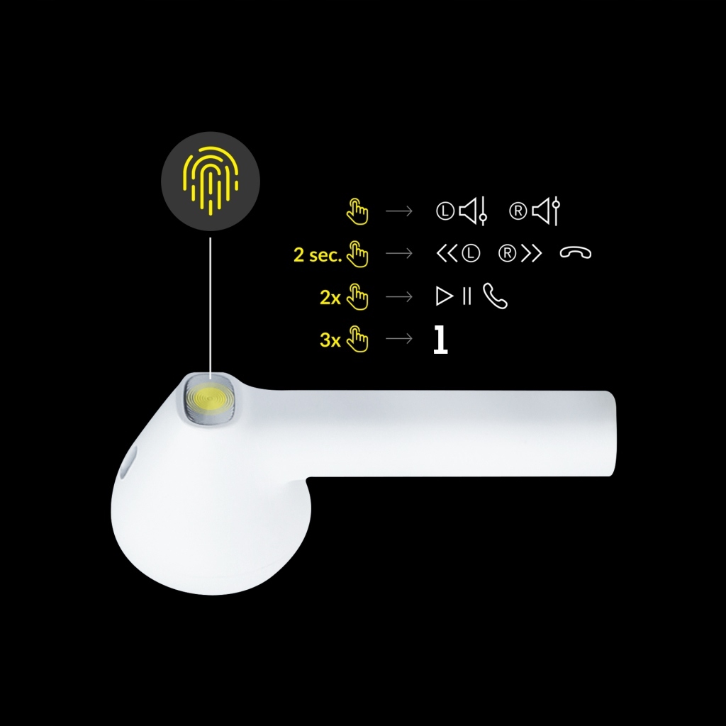 Встроенная сенсорная панель в каждом наушнике позволяет удобно управлять звуком в любой ситуации, а тройным касанием подключиться к Ассистенту на телефоне (1).