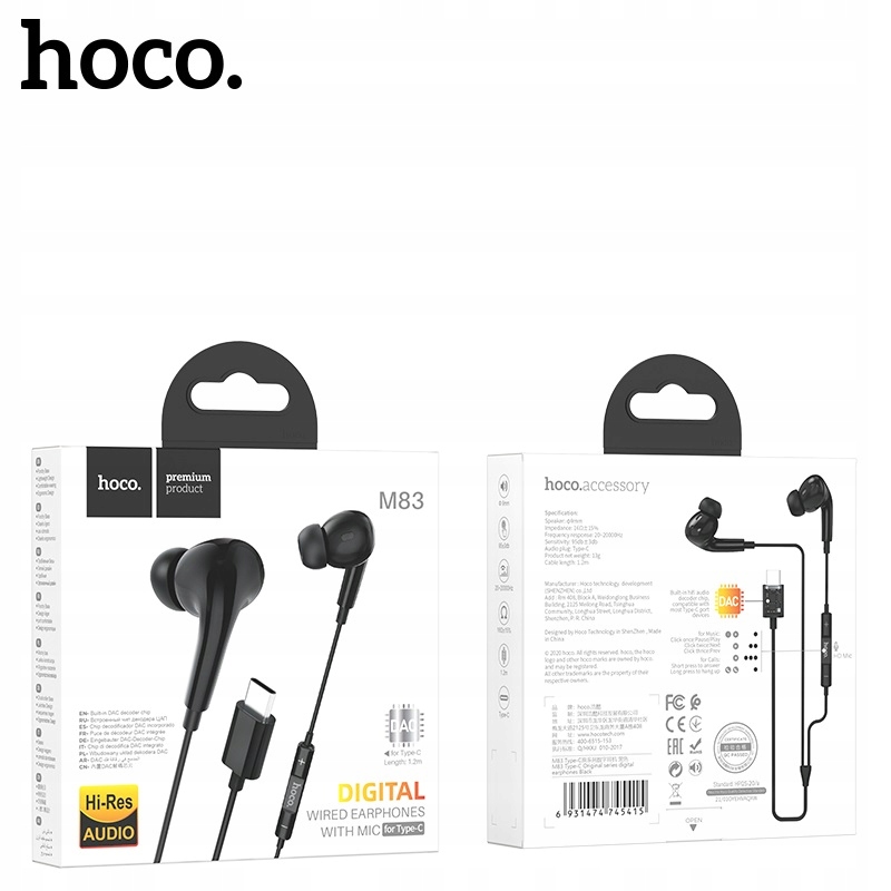 hoco. Серия M83 Original — кабельные аудионаушники с разъемом USB. разъем -C/Type C, оснащенный микрофоном для телефонных звонков и кнопками управления музыкой или звонками, а также регулировкой громкости. В наушниках имеется встроенный цифровой ЦАП, отвечающий за качество воспроизводимой музыки и совместимость с мобильным устройством.