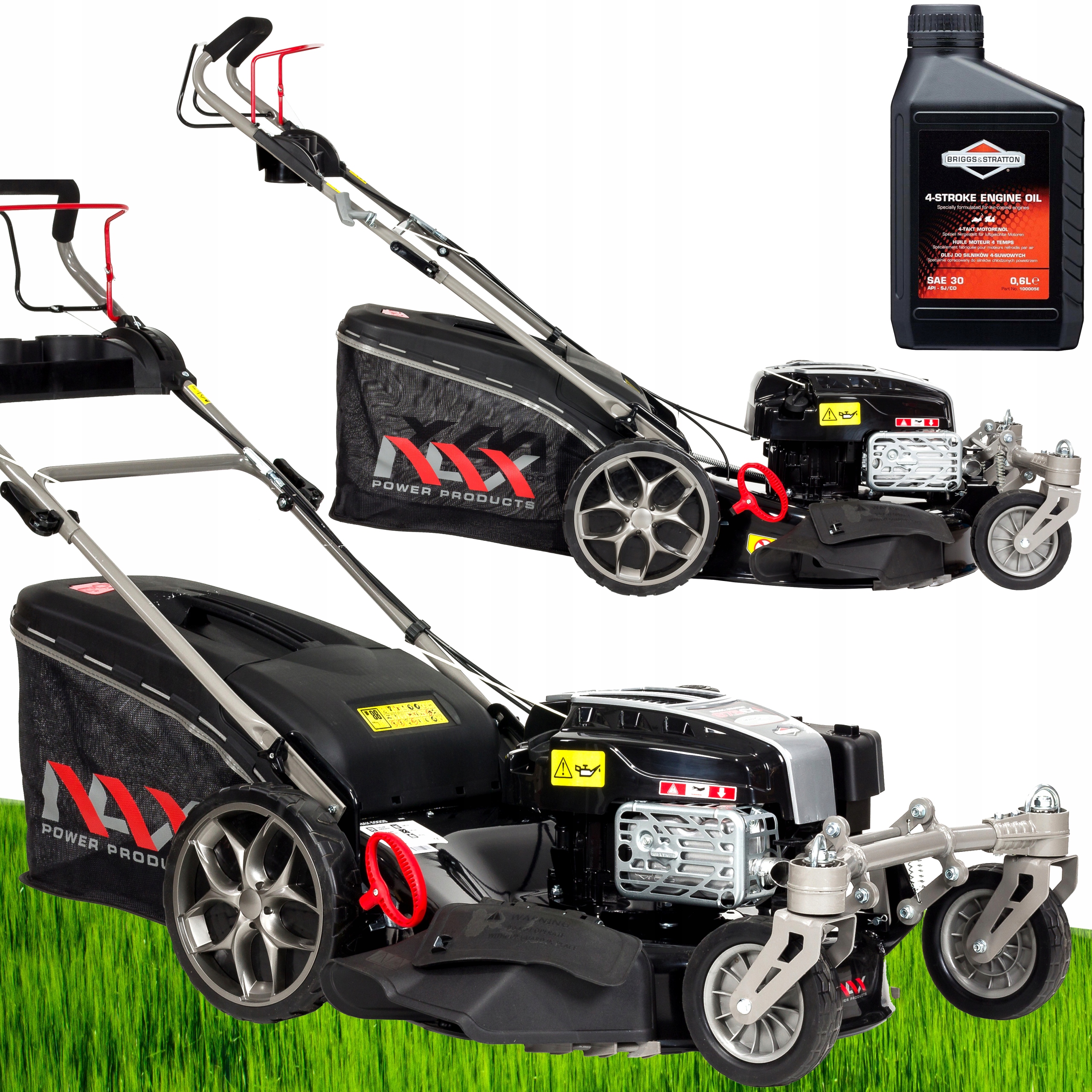 стальной армированный корпус этой косилки был оснащен системой промывки, так что после подключения садового шланга и запуска двигателя вы можете быстро вымыть дно косилки с остатков травы. Выполняя эту деятельность, мы значительно продлили срок службы устройства. (Влажная трава вызывает быструю коррозию металла).