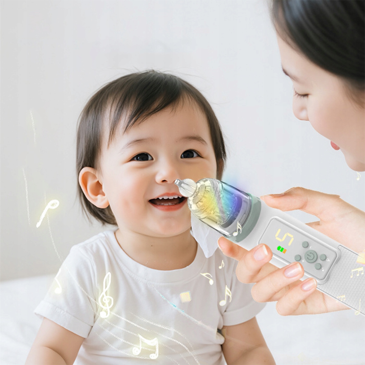 Детский назальный аспиратор оснащен веселыми песнями и яркими огнями. Он привлекает внимание ребенка, доставляя ему комфорт и радость, а также эффективно снижает сопротивление при сосании носа. Электрический назальный аспиратор можно использовать даже пока ребенок спит, без риска раздражения или дискомфорта.