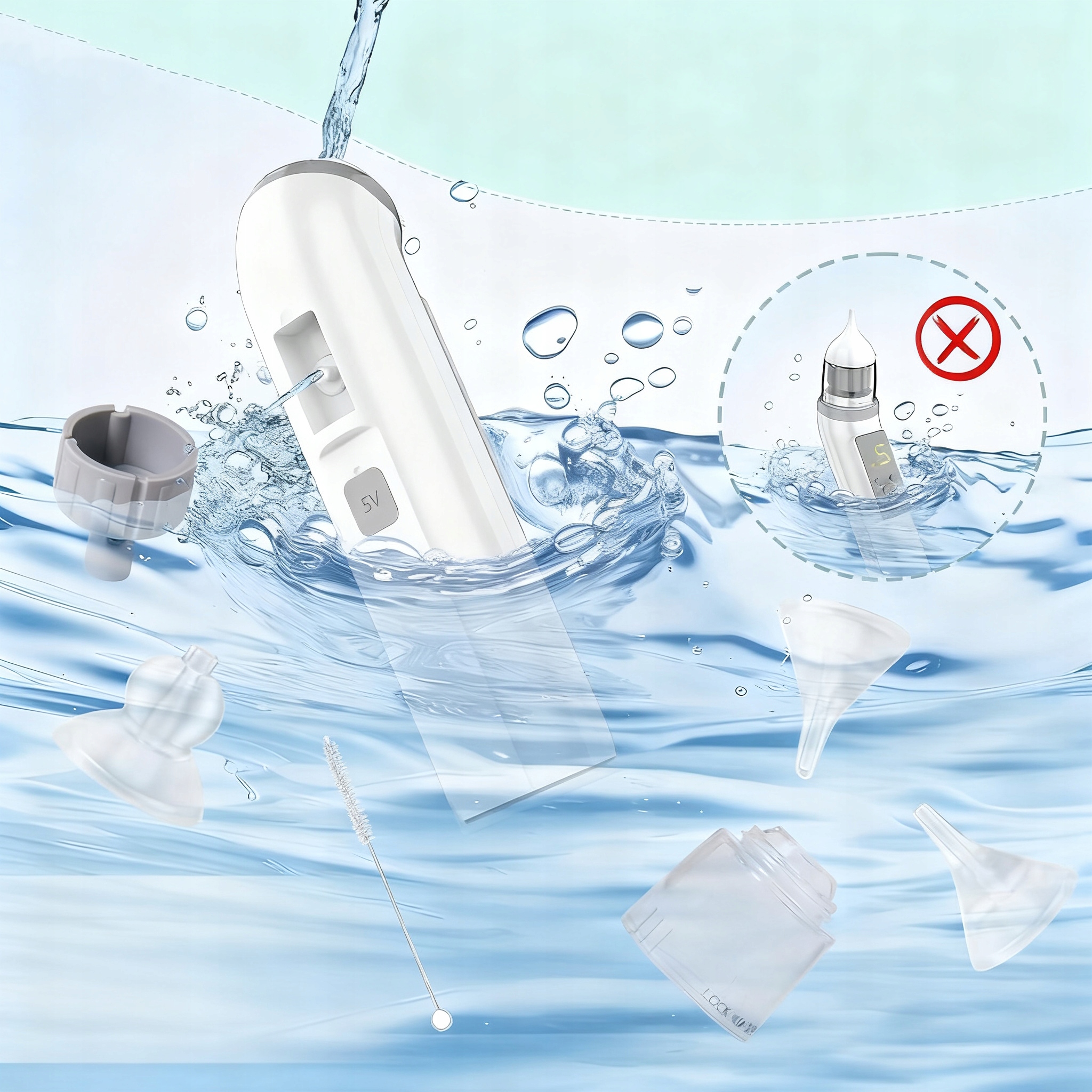 Назальный аспиратор легкий и компактный, имеет эргономичный дизайн и ЖК-дисплей. Устройство можно мыть и проверять на работоспособность, что делает его простым в использовании и подходящим для пользователей всех возрастов. Назальный аспиратор водонепроницаем (IP65). Щетка для чистки, входящая в комплект, позволяет промывать аспиратор теплой или холодной водой. Рекомендуется мыть аспиратор после каждого использования, чтобы не беспокоиться о контакте ребенка с микробами.