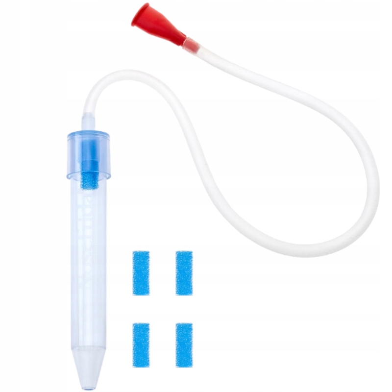 - После каждого использования разбирайте устройство, как показано на изображении (инструкция в упаковке). Удалите остатки выделений с наконечника аспиратора, промыв его под проточной водой, и выбросьте вставленный внутрь одноразовый фильтр. Затем промойте все разобранные детали в теплой воде с мягким раствором жидкости. Промойте и тщательно высушите.