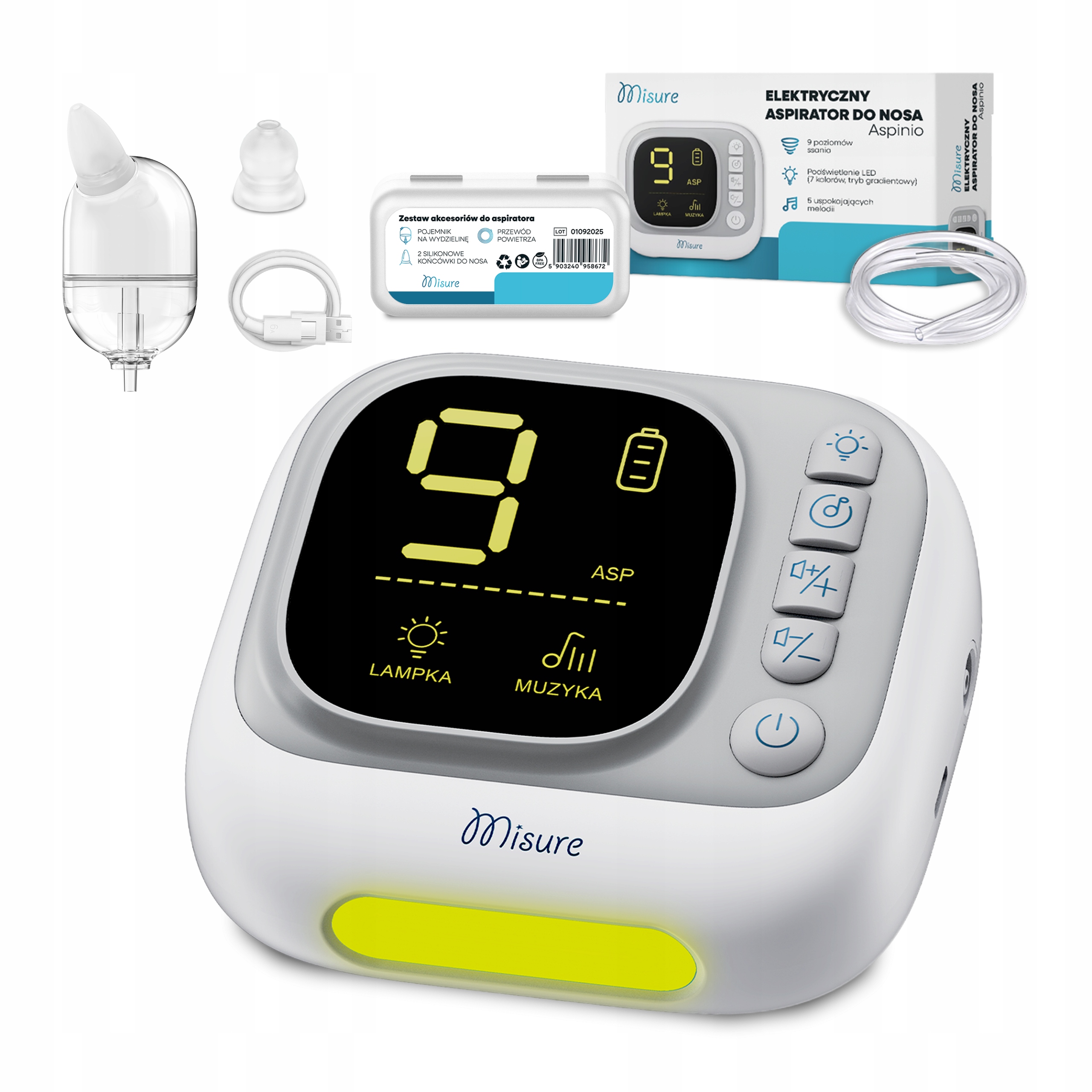Misure Aspinio — незаменимая поддержка для родителей, которые хотят быстро и безопасно почистить нос ребенку, без стресса и без риска раздражения. Благодаря регулируемой силе всасывания, мягким наконечникам и интуитивно понятному управлению прибор подходит как для новорожденных, так и для детей постарше. Он удобен, гигиеничен и призван принести облегчение вашему ребенку в любой ситуации - дома, в путешествии и ночью.