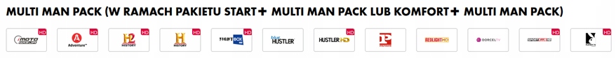 Start+ Multi Man Pack и Komfort+ Multi Man Pack предназначены для взрослых. Некоторые каналы, входящие в состав Multi Man Pack, содержат эротические сцены. Активация пакетов возможна только после звонка в офис обслуживания клиентов: 22 430 77 77 (стоимость подключения согласно тарифам операторов) и электронного письма с подтверждением изменения условий предложения