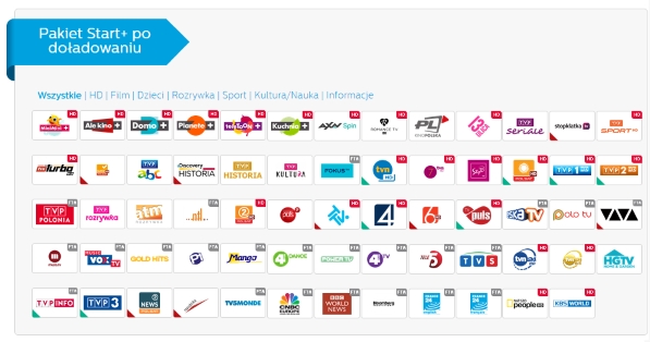 - предложение без договора, с пополнением от 19,99 злотых в месяц (более 50 каналов)